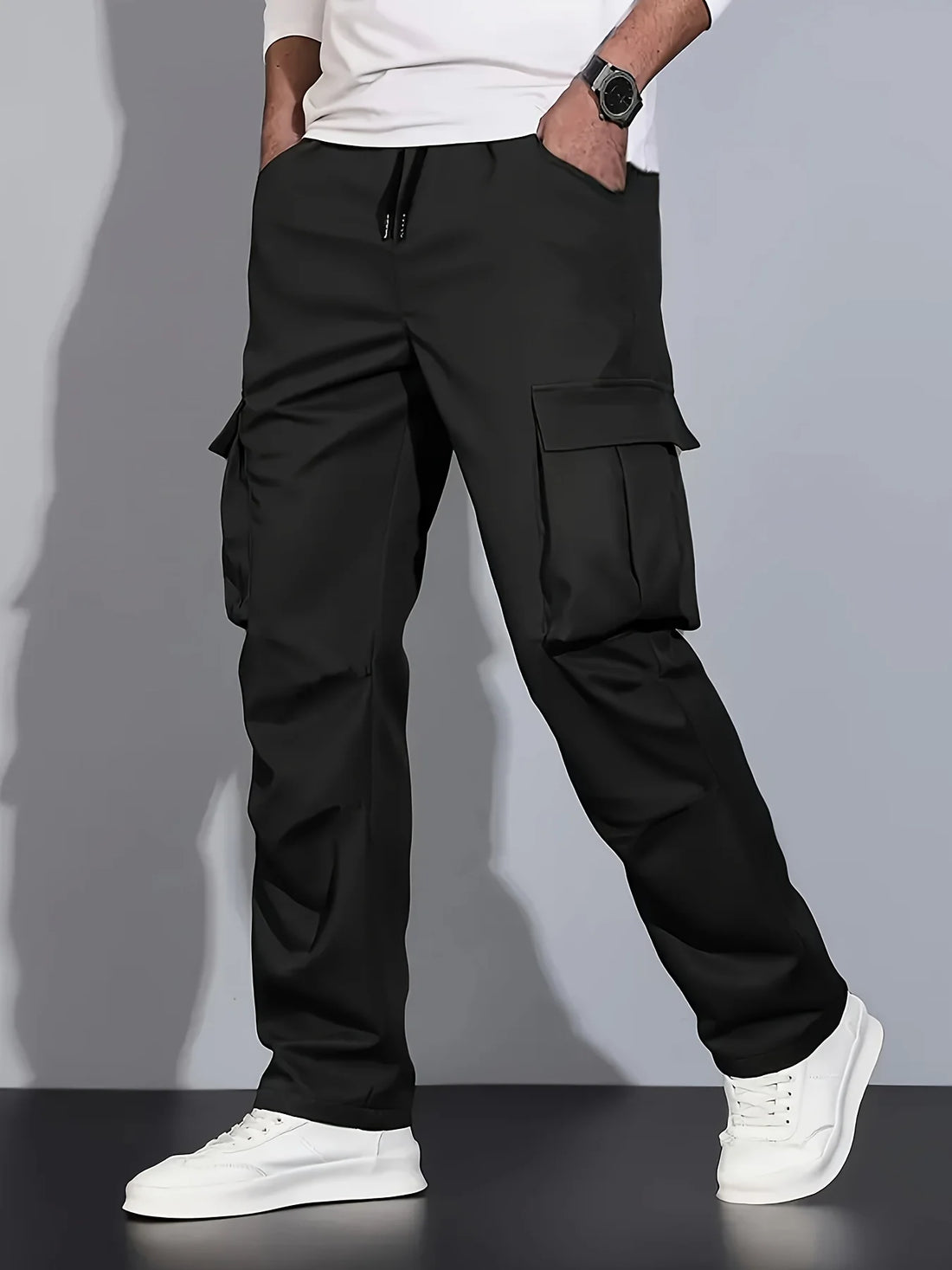 Woven fabric new hot selling solid color casual stock ordinary Men's casual loose straight tube workwear drawstring multi pocket
