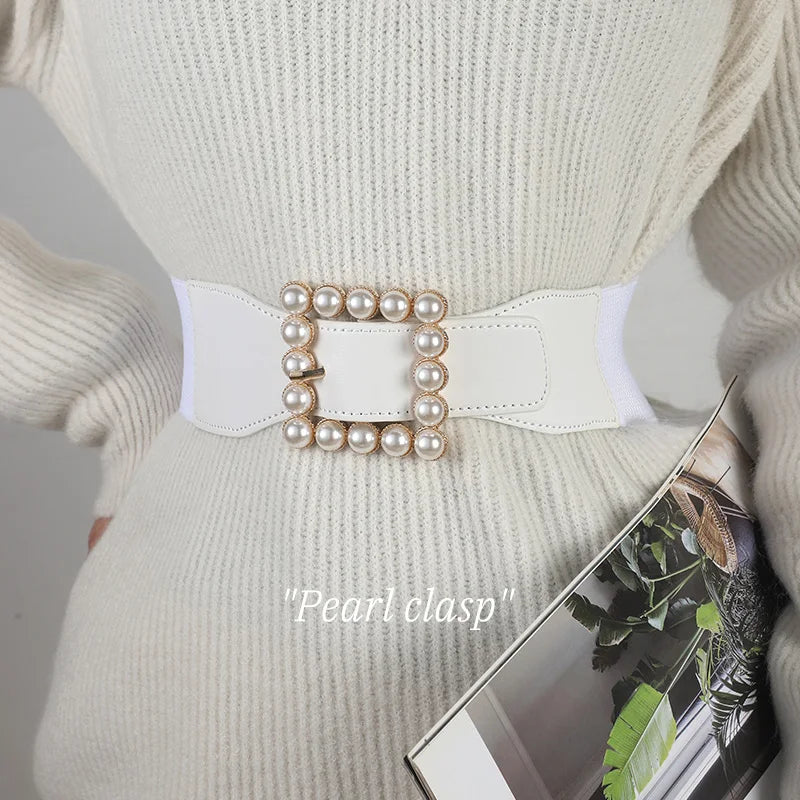 Belt Women's Instagram Style Fashionable, Simple, and Fashionable Decoration Pearl Belt with Sweater Elastic Elastic Black Wide