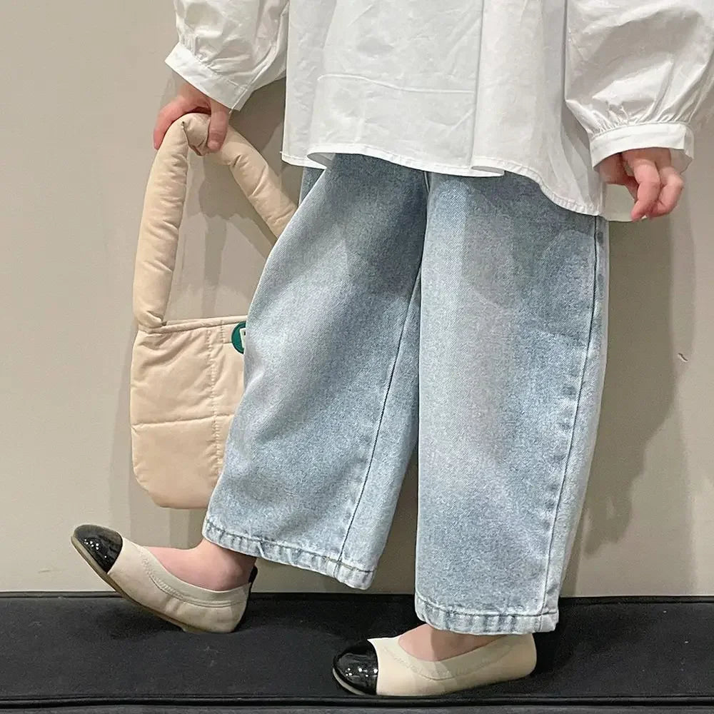 2023 wide leg pants jeans elastic waist ankle length loose straight cotton clean solid soft comfortable new korean children girl