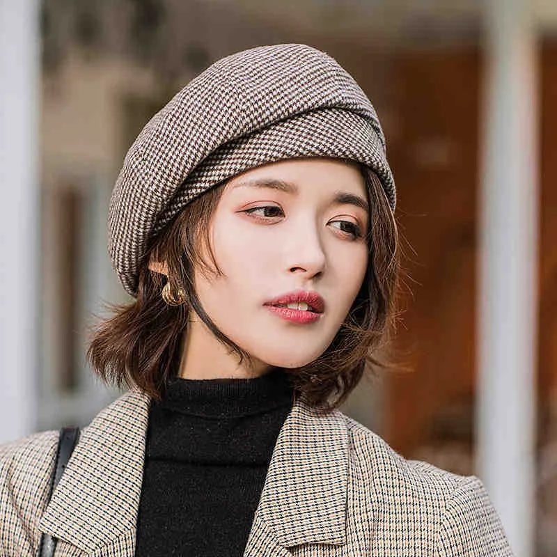 Simple Women Wool Beret for Elegant Lady Winter Female Cotton Hats Plaid Vintage Octagonal Casual Autumn Cap