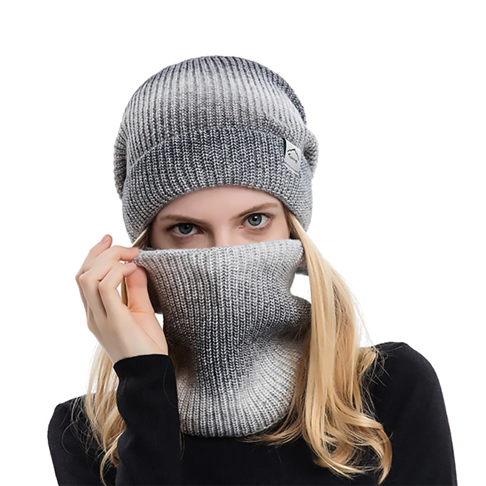 Women's Winter Keep Warm Beanie Scarf Set 2 Pieces Lady Fleece Lining Woolen Yarn Hat Knit Neck Gaiter Gradient Color Wholesale