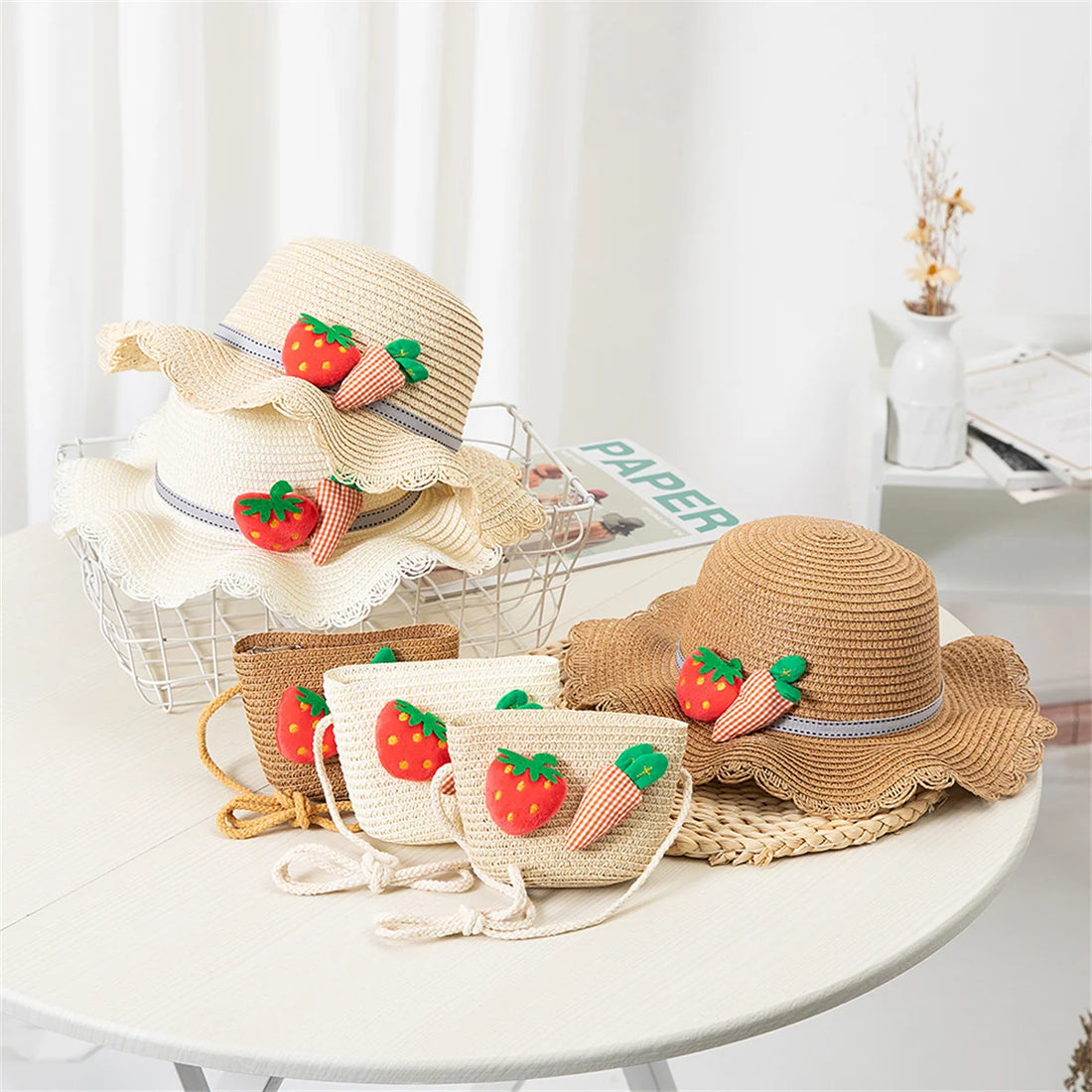 Outdoor Straw Hat Shoulder Bag Set Sun Caps Kids Girl Breathable Beach Hats Cherry Princess Seaside Panama Hat for Spring Summer