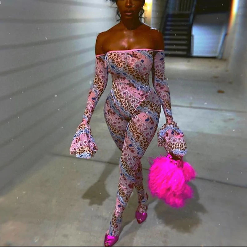 Women Sexy See-through Slash Neck Flared Sleeve Nightclub Outfits Overalls 2024 Hipster High Waist Floral&Leopard Print Jumpsuit