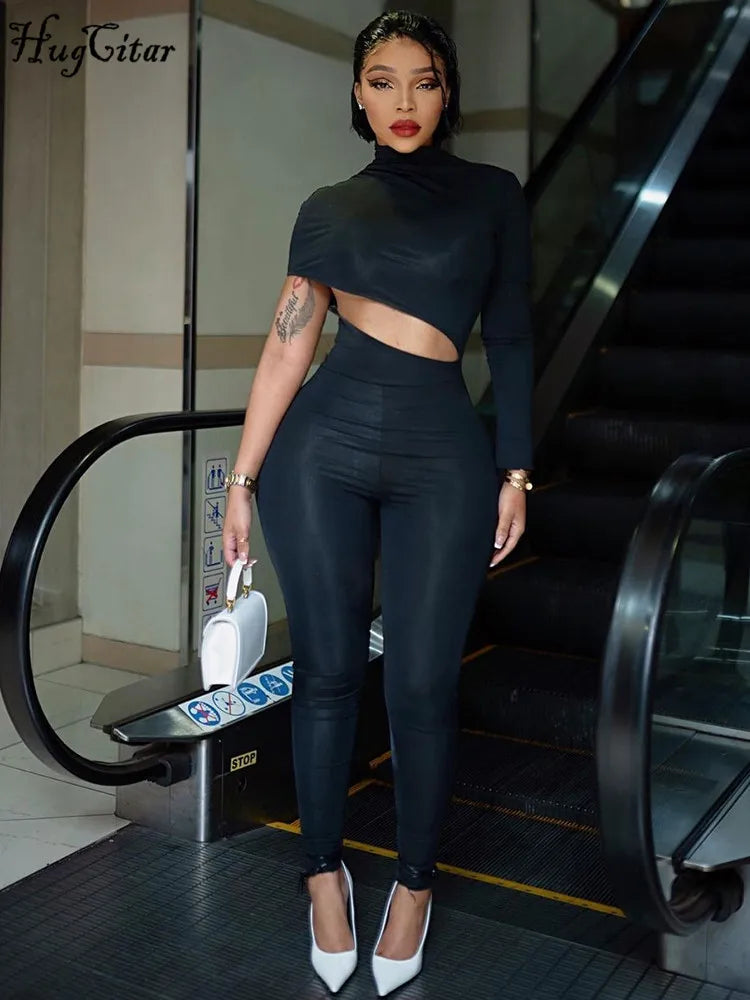 Hugcitar Black Long Sleeve Asymmetrical Hollow Out Zip Up Sexy Bodycon Jumpsuit Summer Women Party Nightclub Romper Overalls Y2K