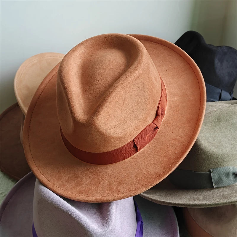 2025 new Suede Hat Trilby Stiff Short Brim Rancher hat for men Curved eaves classic fedora Bow vintage hat sombrero hombre