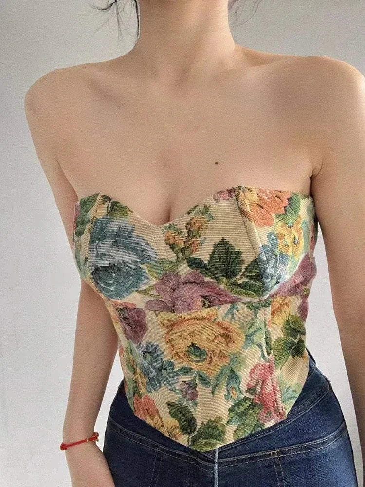Textured Floral Corset Top Summer Vintage Embroidery Off Shoulder Strapless Tube Fit Crop Tank Tops Teen-girl Coquette Outfit