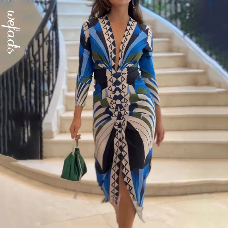 Wefads Long Dress Women Clothing Printed Long Sleeve V Neck Pleated Nipped Waist Slim Slit Casual Dresses Streetwear