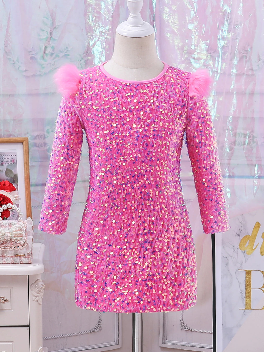 Cute and stylish girls ceremonial dress pink round-neck sequined dresses for spring and fallCute and stylish girls ceremonial dr