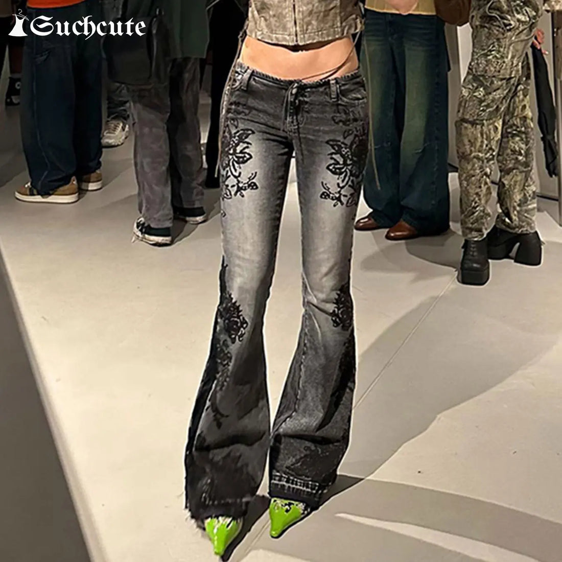 SUCHCUTE Vintage Plant Printed Flared Jeans Y2K Streetwear Low Waist Slim Denim Pant 2000s Washed High Street Women Trousers New