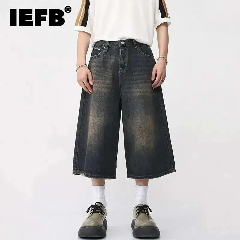 IEFB Korean Style Vintage Men's Jeans Summer Loose Male Wide Leg Knee Length Shorts New Washed Fashion Short Denim Pants 9A8825