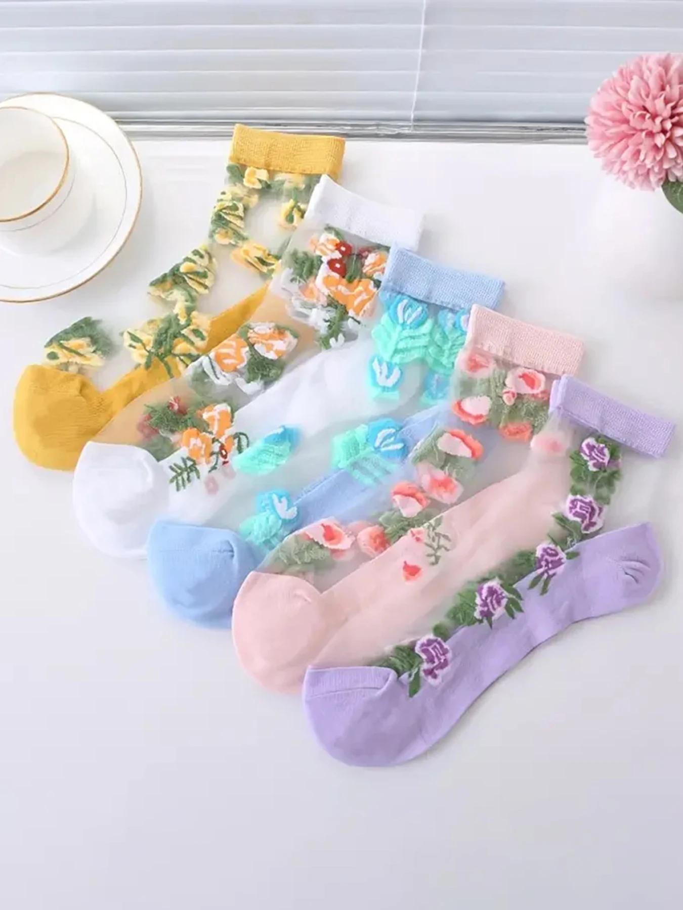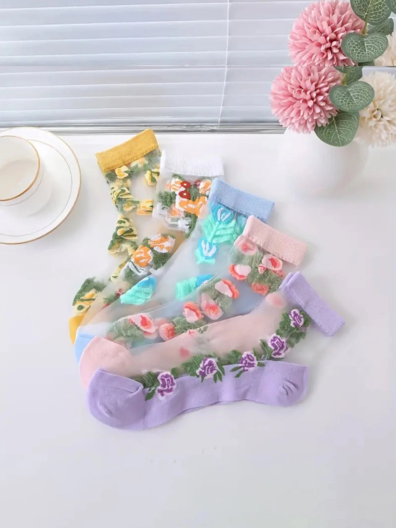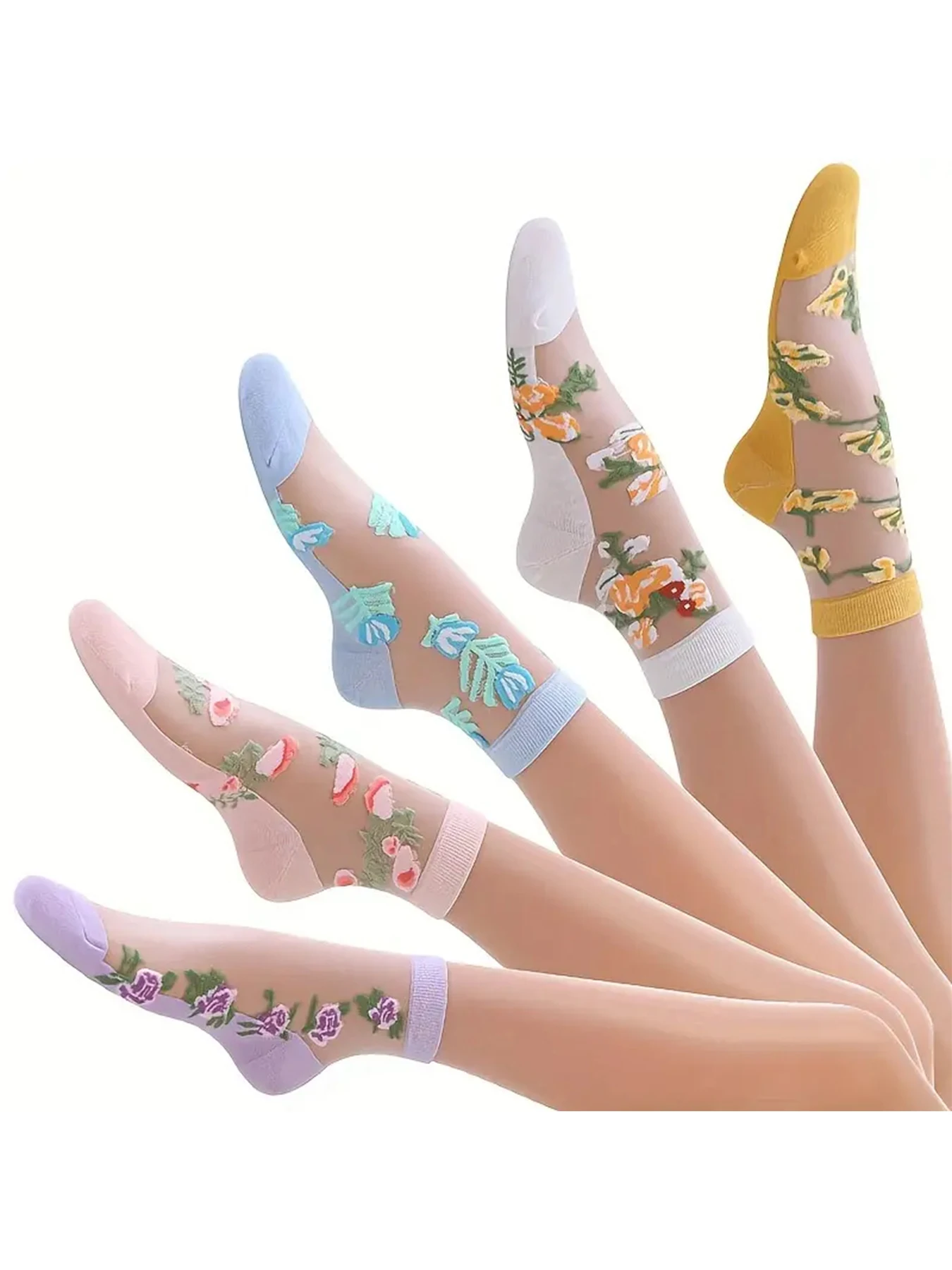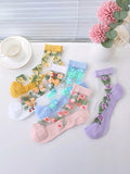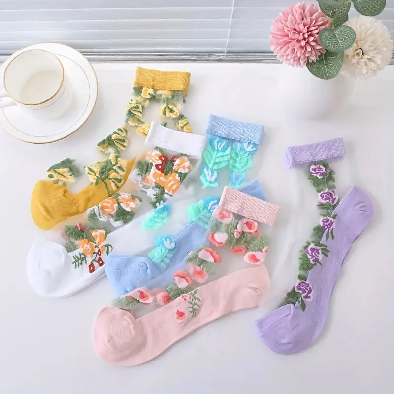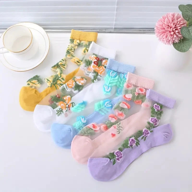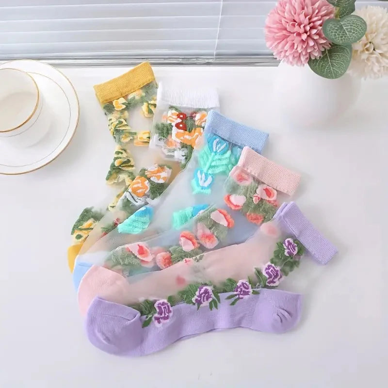 5 Pairs of Vibrant Floral Embroidery Socks - Soft, Lightweight, Breathable, and Sheer Mid Tube Design - Machine Washable, Womens