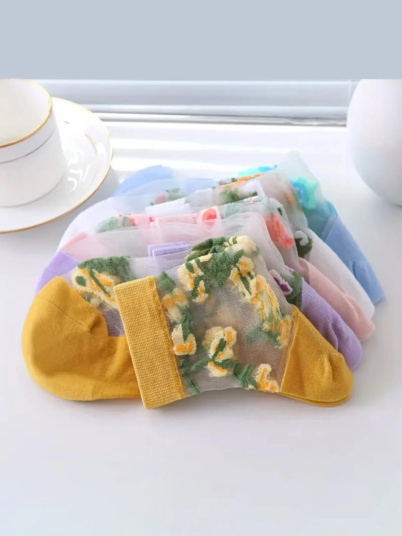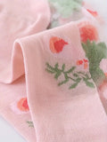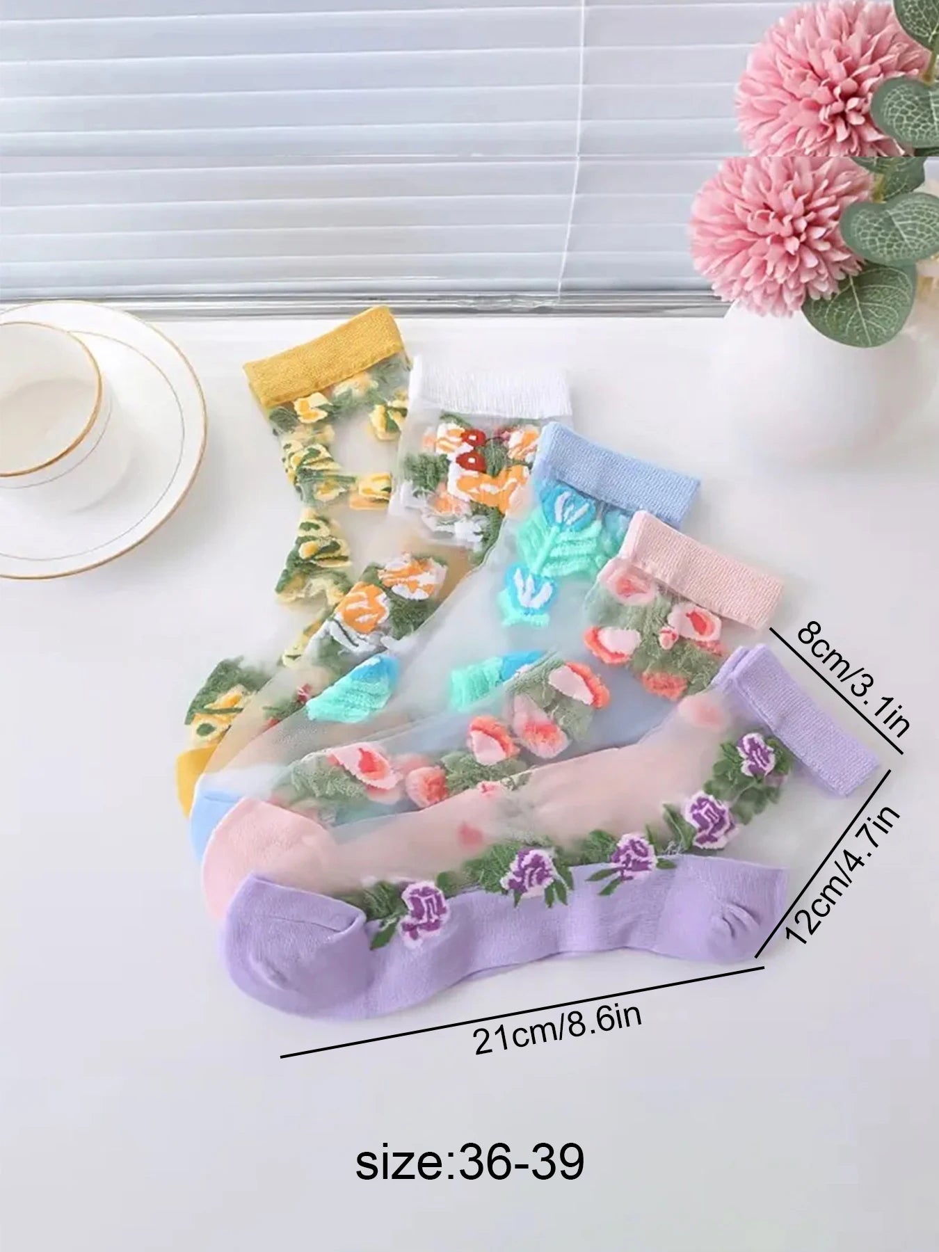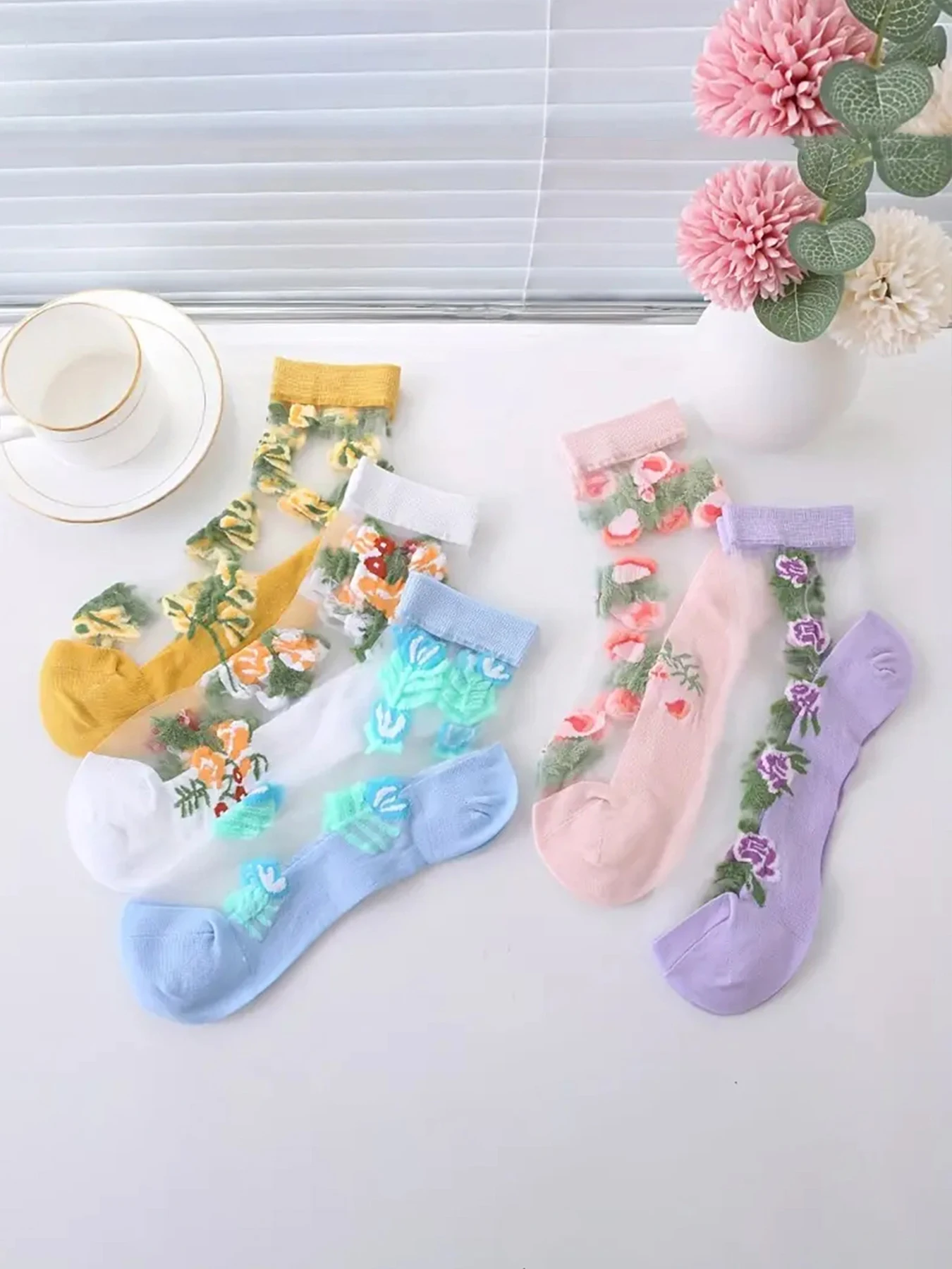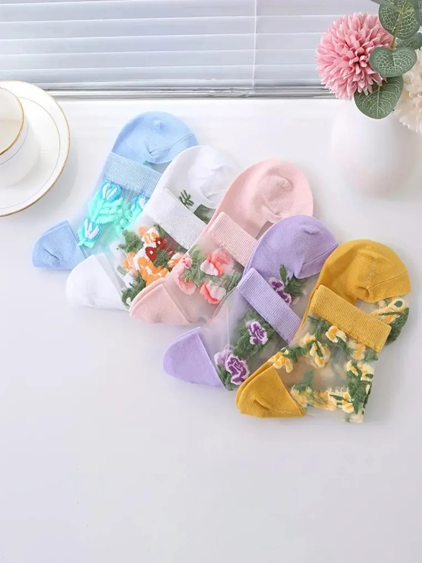 5 Pairs of Vibrant Floral Embroidery Socks - Soft, Lightweight, Breathable, and Sheer Mid Tube Design - Machine Washable, Womens