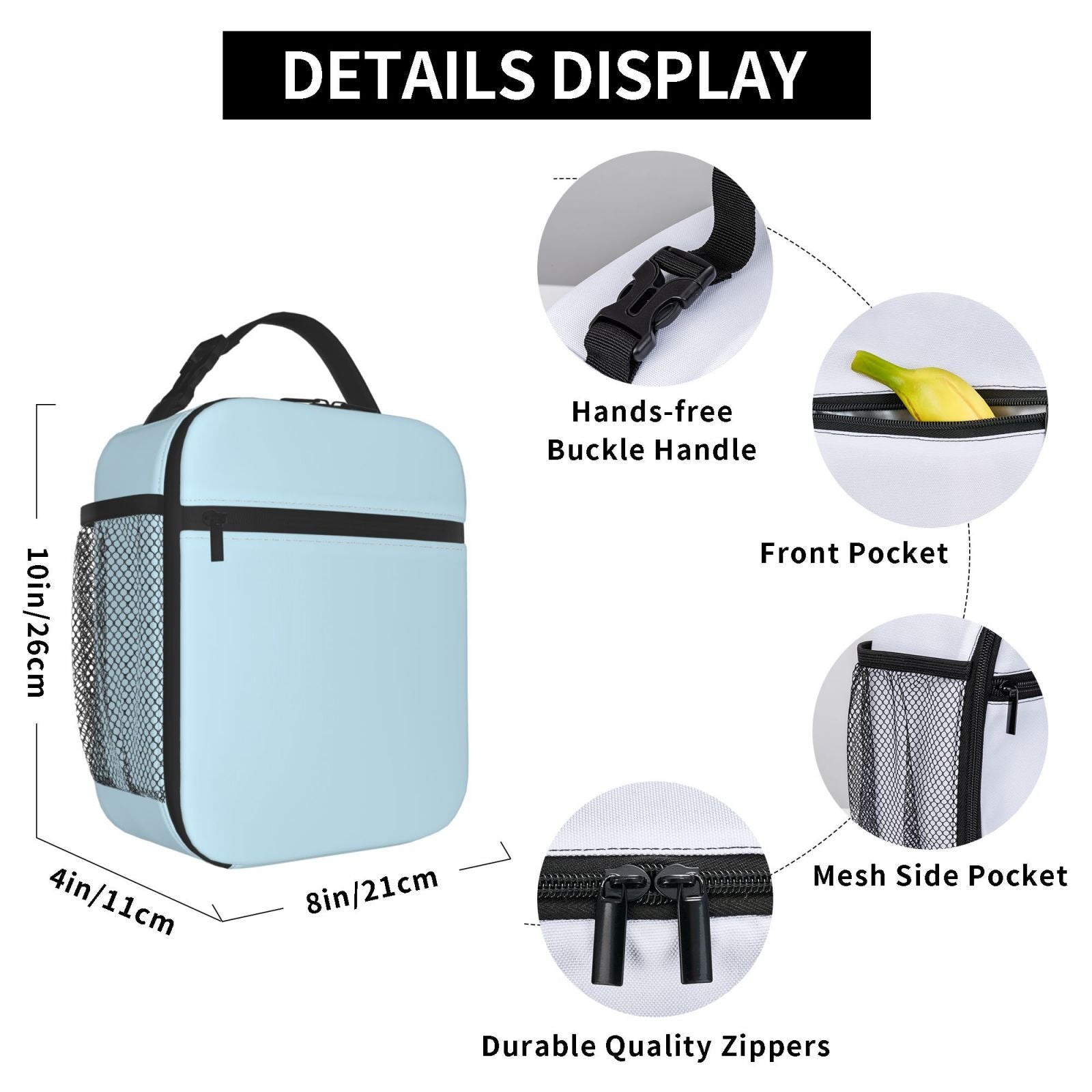Functional: This lunch box with a front pocket for utensils and side mesh pocket to hold beverage. This lunch box can be tied to any backpack and suitcase, making it the ideal lunch pail for work, office, and travel.