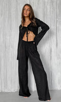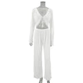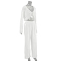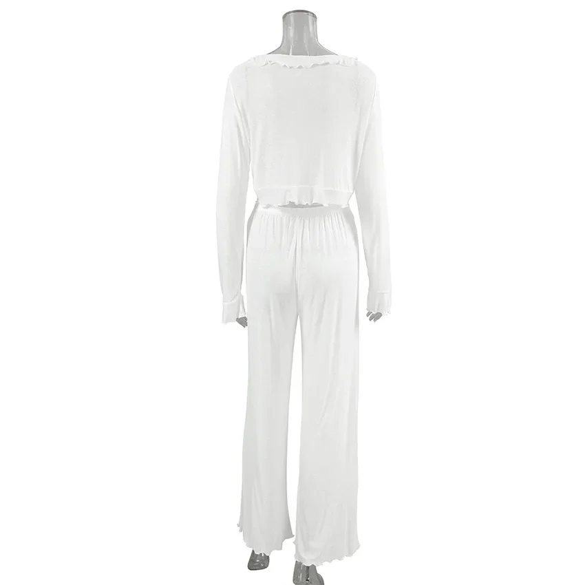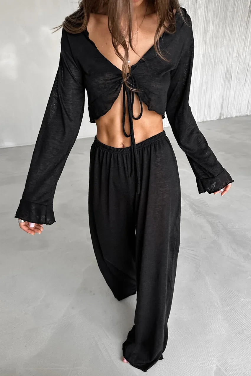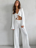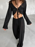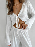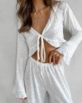 Bornladies Women's Summer Lace Up Loose Casual Long Sleeved Pants Set Fashion Home Clothes Sexy Solid Color Basic Pajamas Set