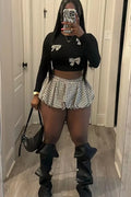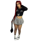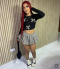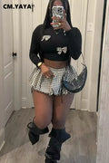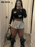 CM.YAYA Women Mini Plaid Skirts Set +Full Sleeve Bow T-shirts Two 2 Piece Set Outfits Fall Casual Street Night Club Cute Outfits