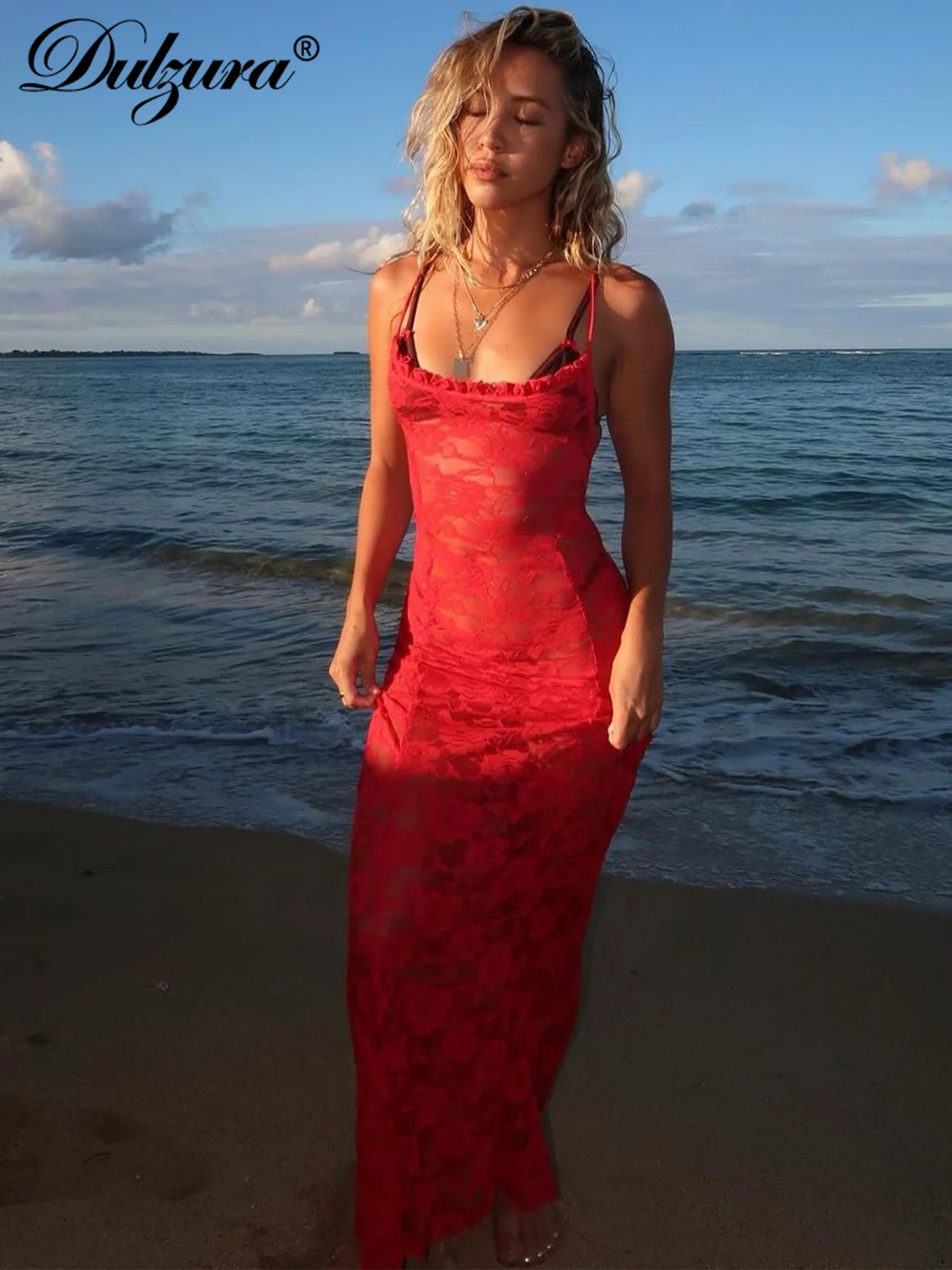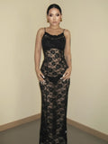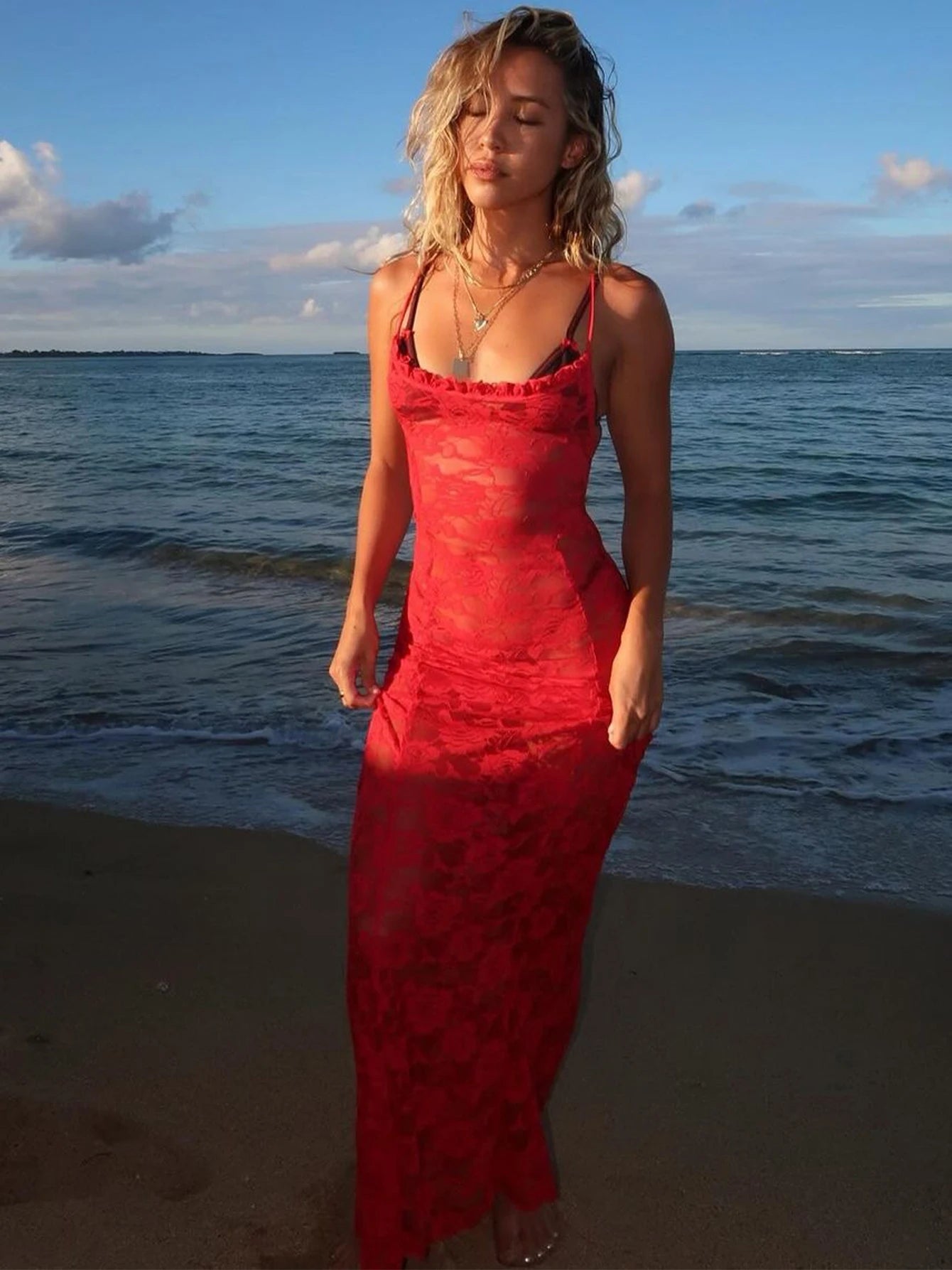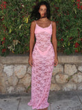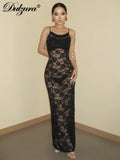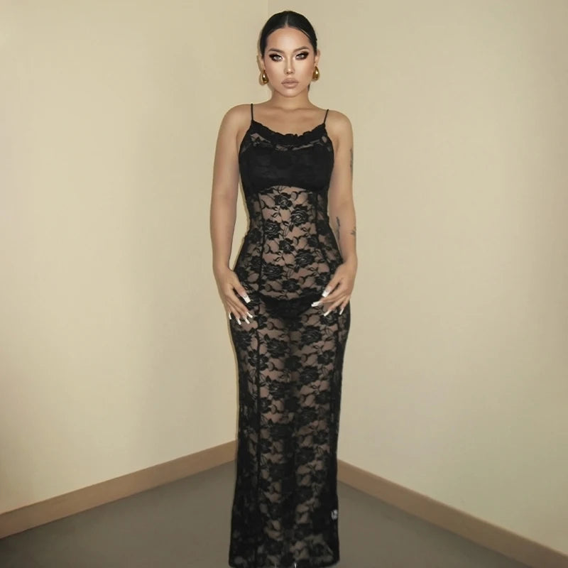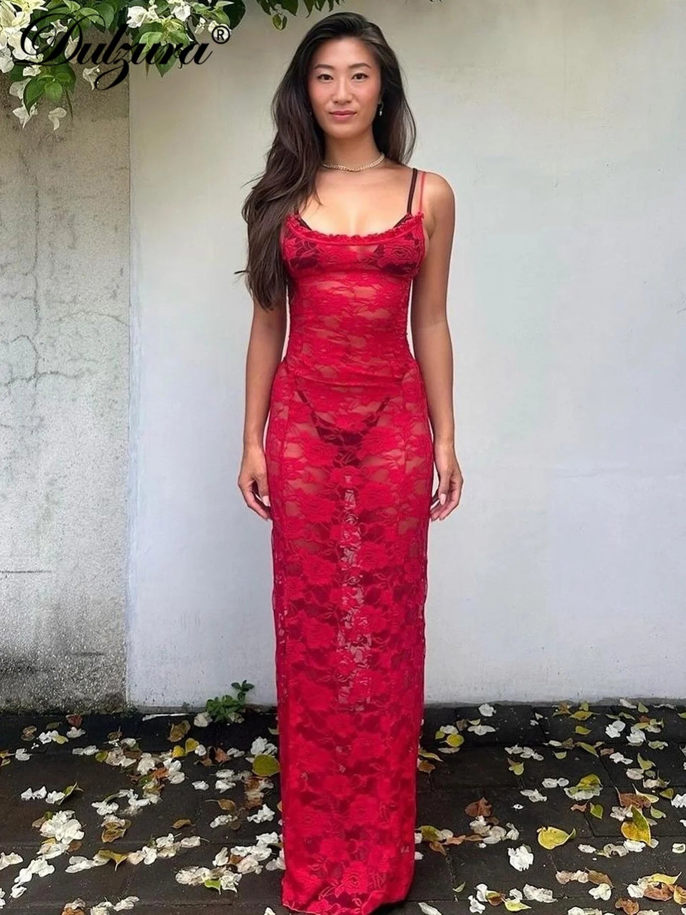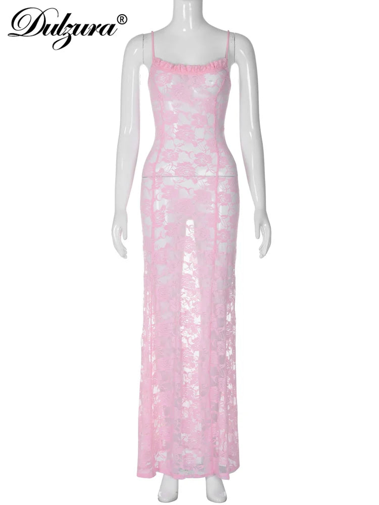 Dulzura See Through Ruffled Patchwork Lace Cami Maxi Dress Sleeveless Sexy Long Dress Party Club Autumn Y2K