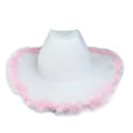 This Pink Cowgirl Hat features a turned-up brim with feather trim. The cowgirl hat is lightweight, comfortable and features a white corded chin strap.