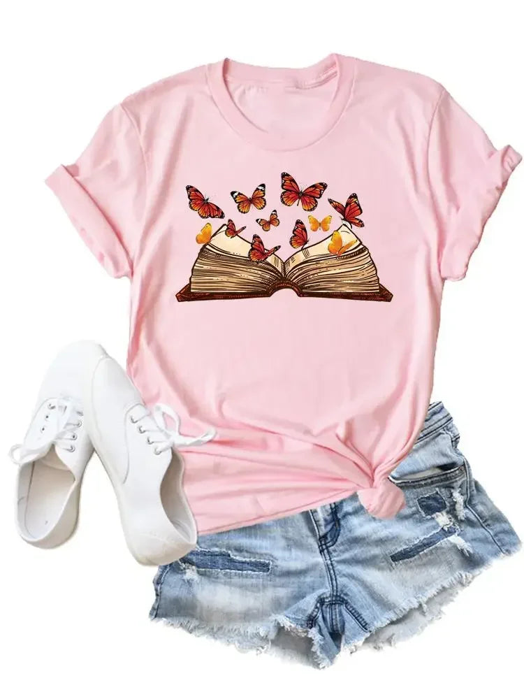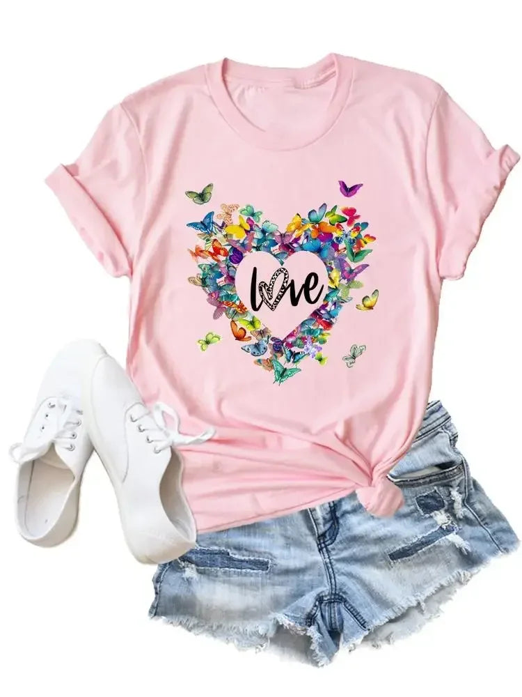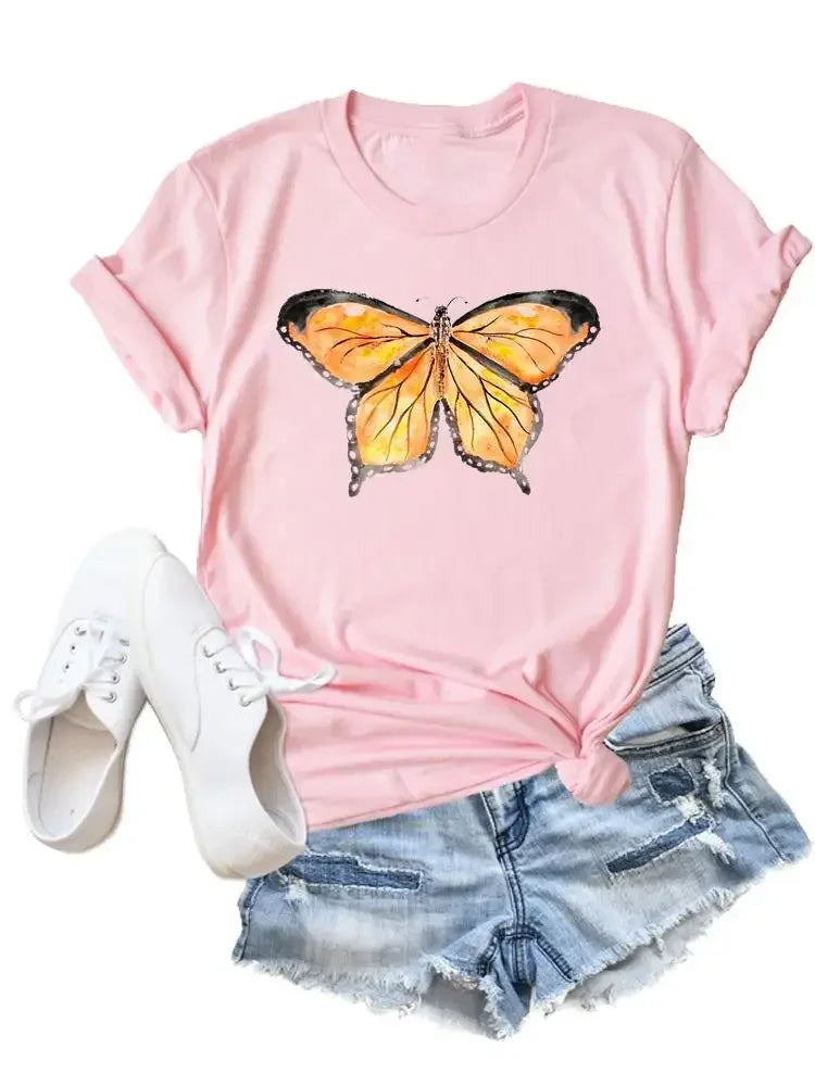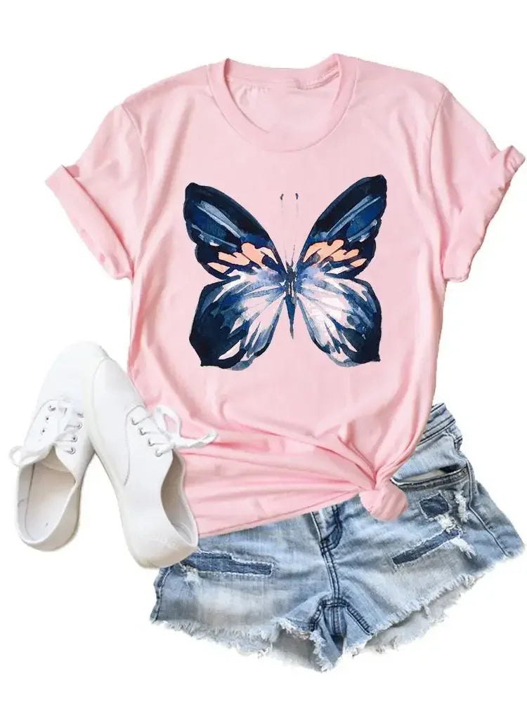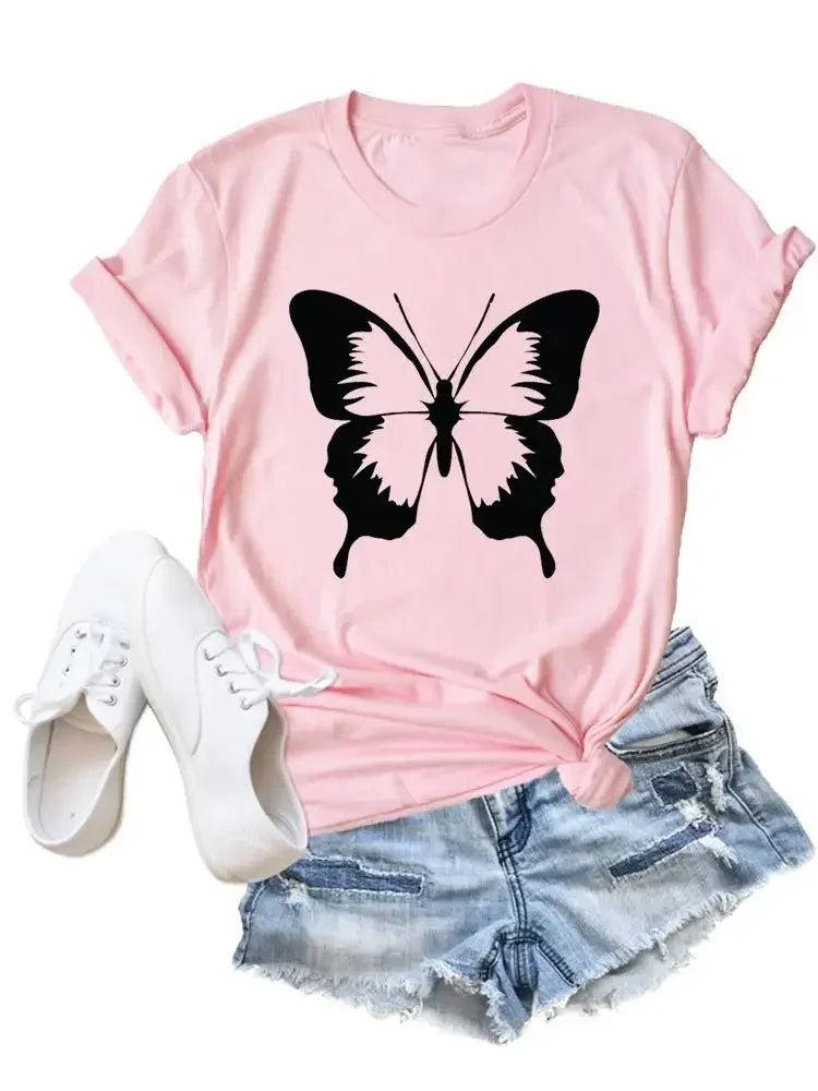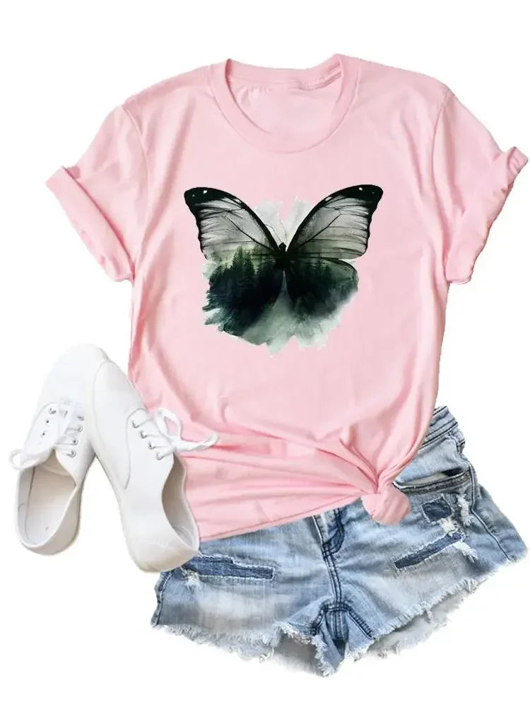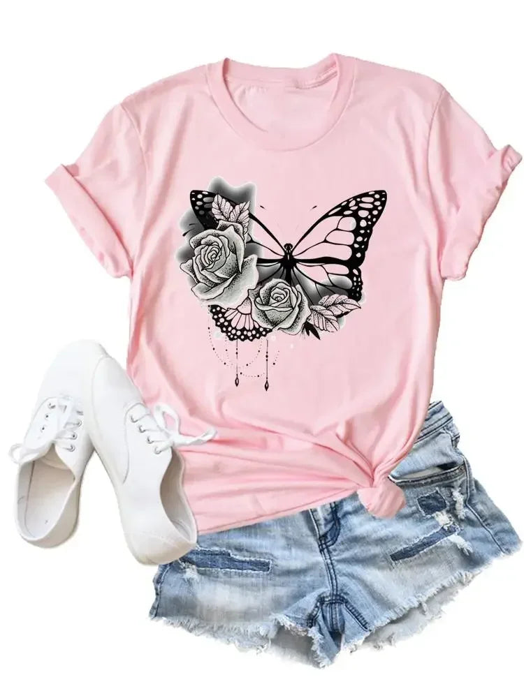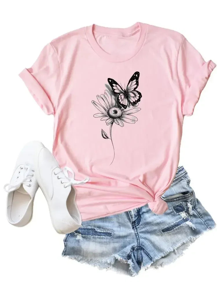 Flower Butterfly Style Trend Clothing Fashion T-Shirt Cartoon Tshirts Summer Tee Women Lady Print Casual Graphic T Top