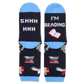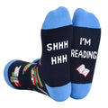 READING GIFTS: These Reading Gifts Book Lover Gifts Teacher Appreciation Gifts Funny Book Socks Student Teacher Socks Crew Socks feature a black base contrasted with blue rims, adorned with numerous books and apples on the top. The bottom is sewn with a hilarious hidden message: "SHHHHHH, I'M READING." These nerdy socks are the perfect gift for your bookish friends.