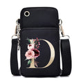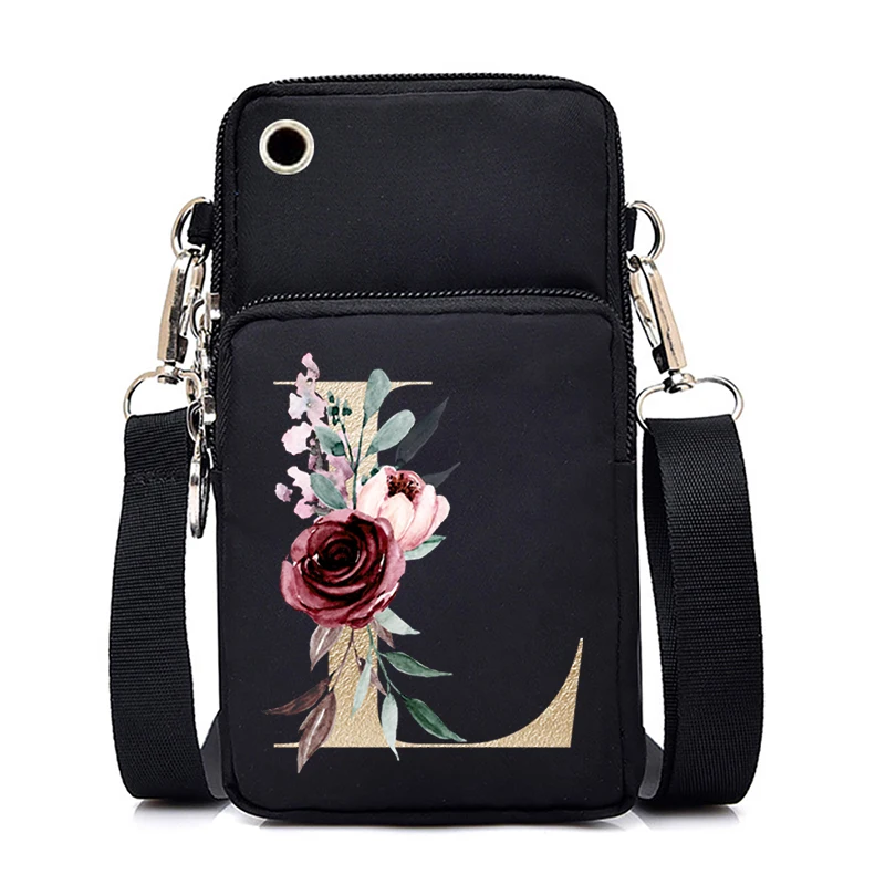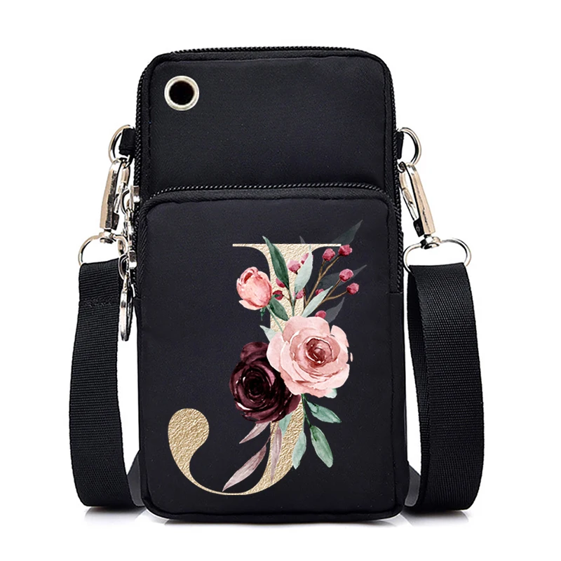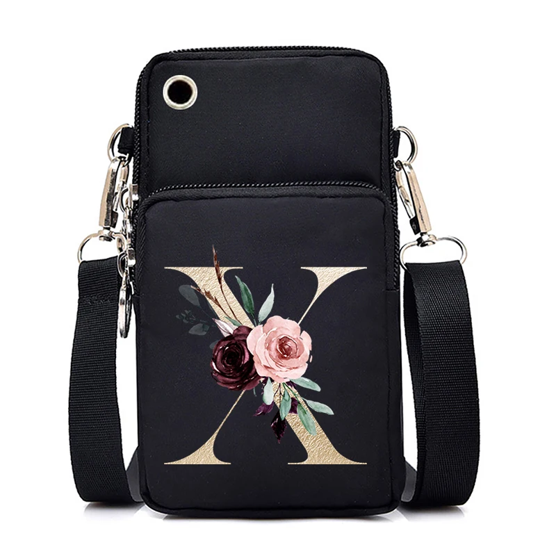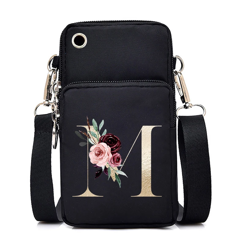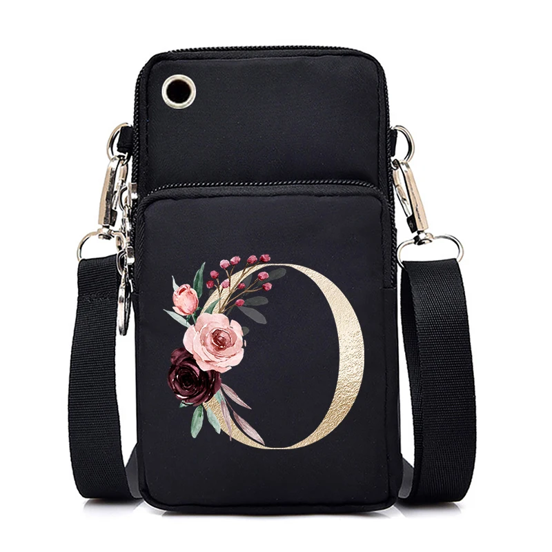 Gold Color Letters A B C D Mini Mobile Phone Bag Pink Flower Alphabet Vertical Handbag 26 Initials Flower Woman Purse Handbags