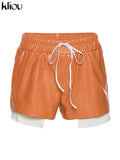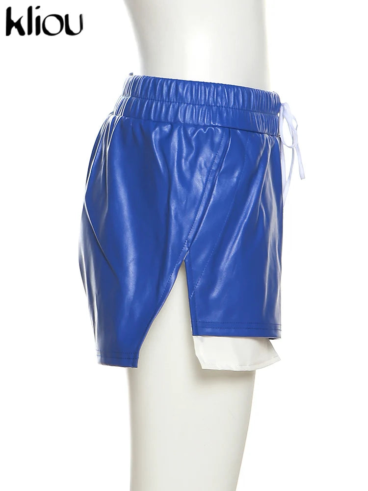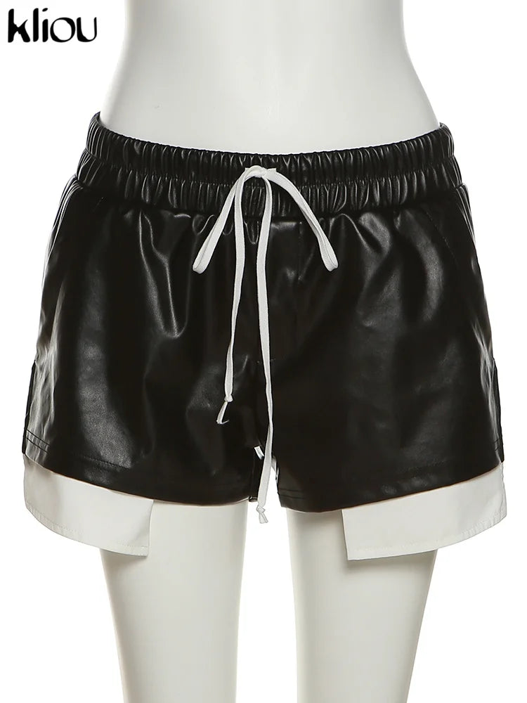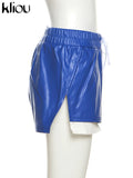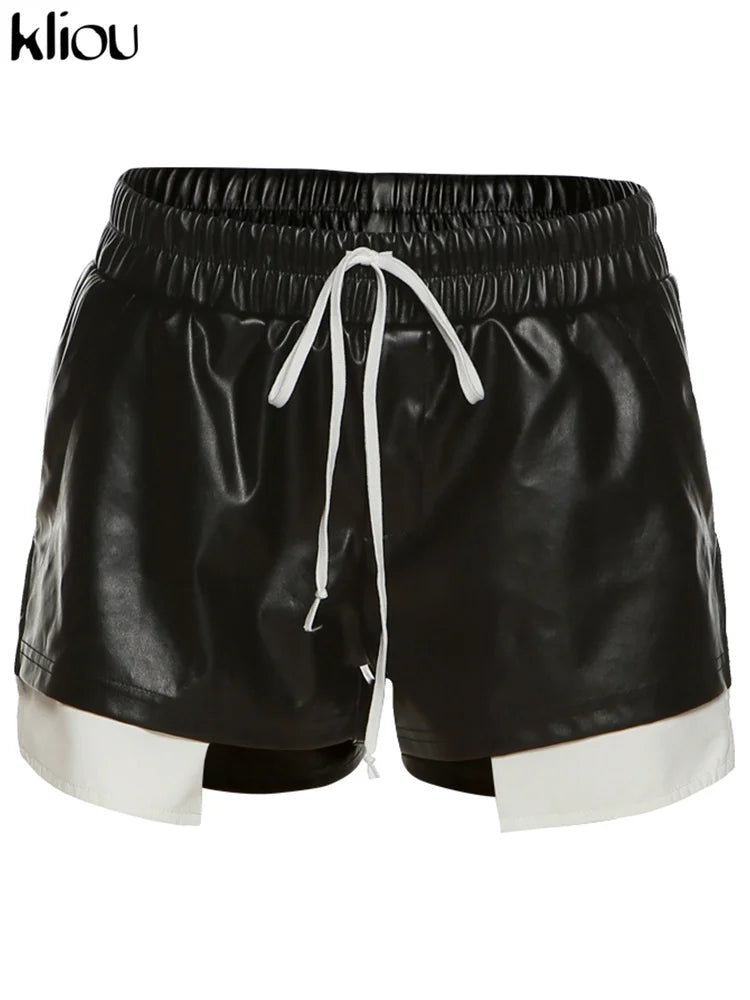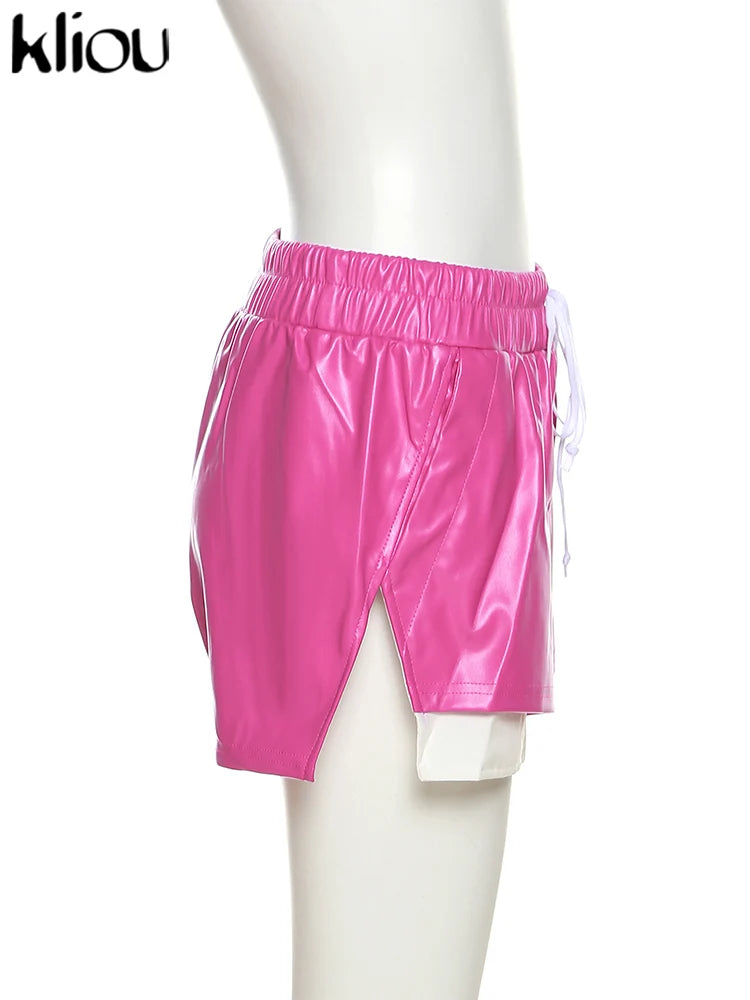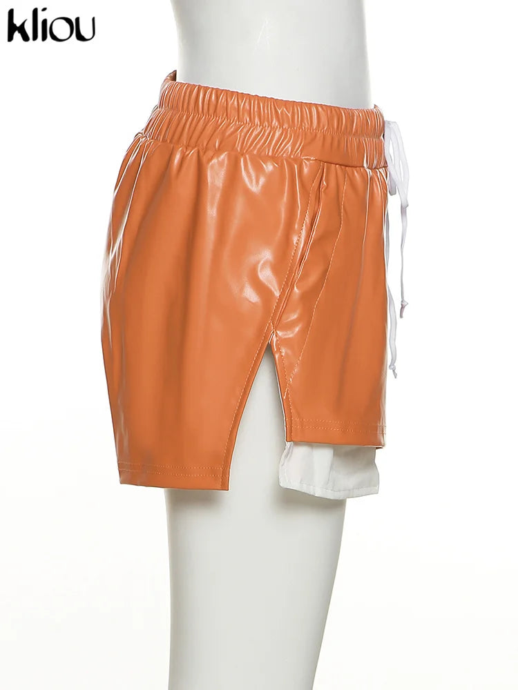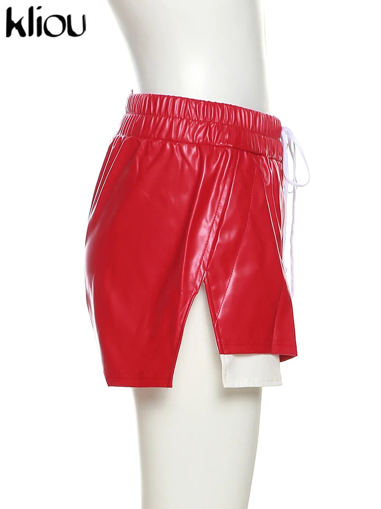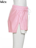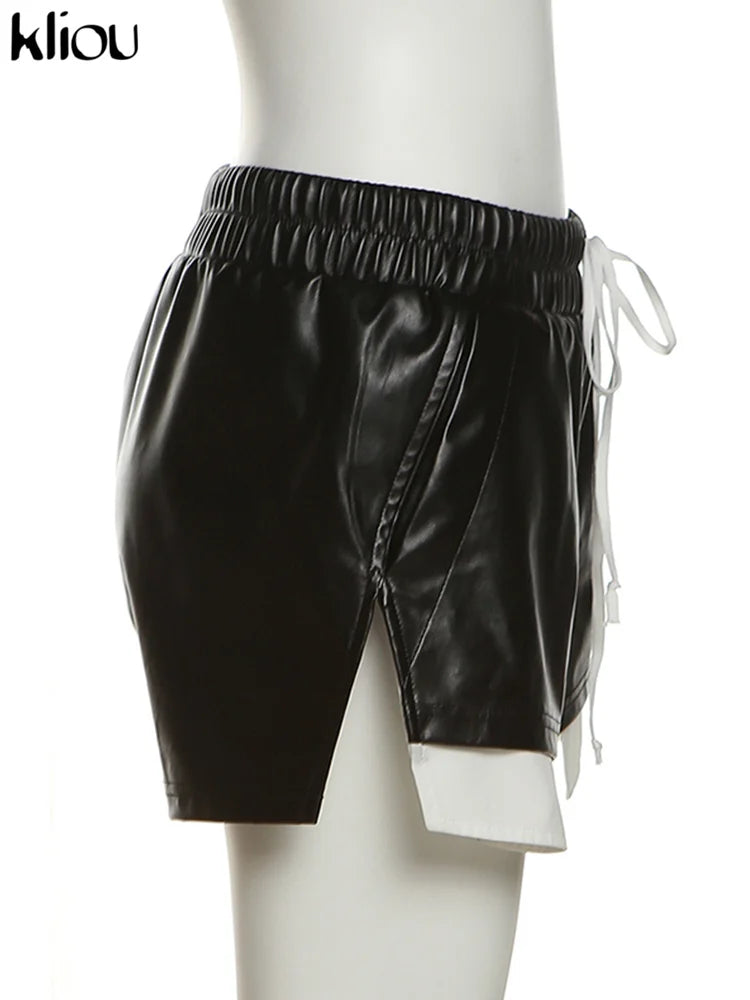 Kliou Faux PU Leather Patchwork Shorts Women Casual Summer Loose Bandage Elastic Waist Slit All-Match Bottoms Leisure Clothing