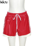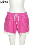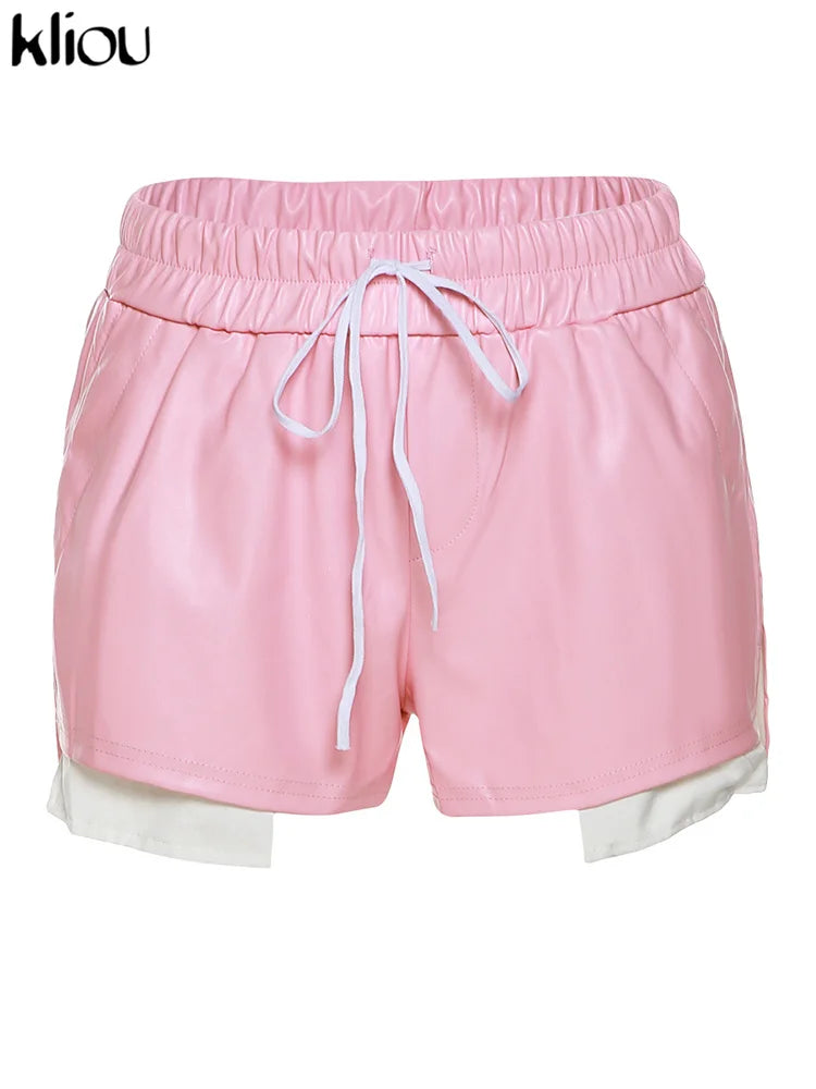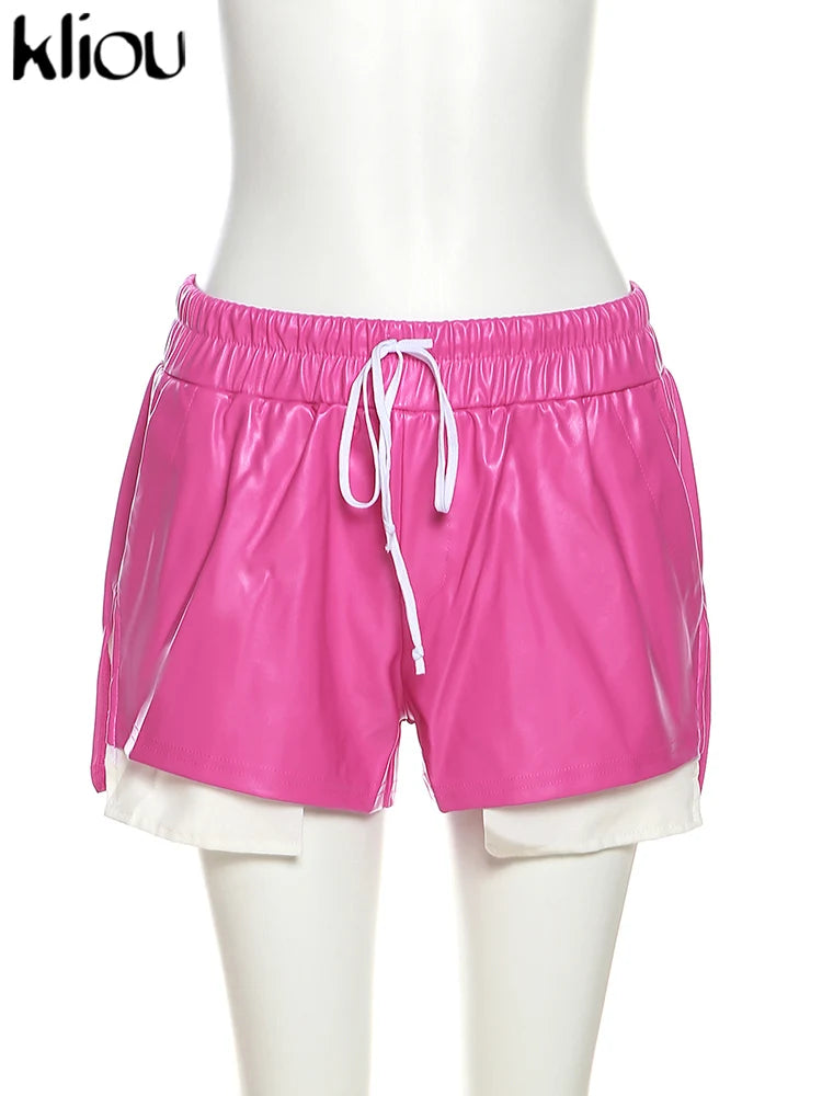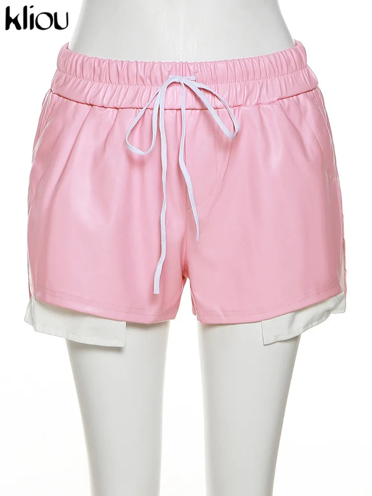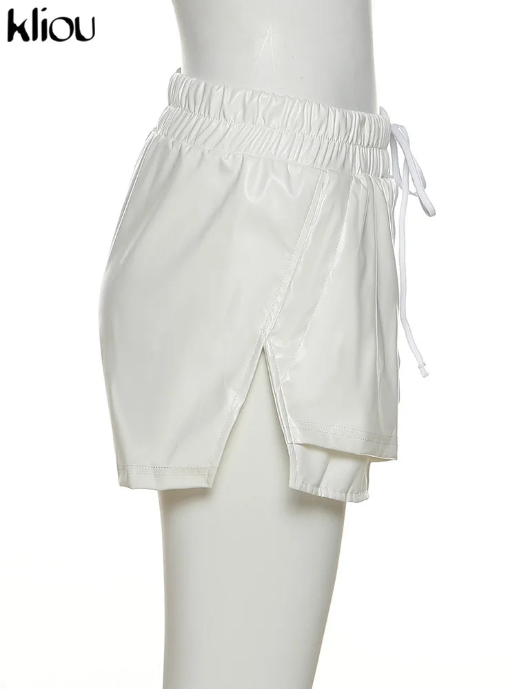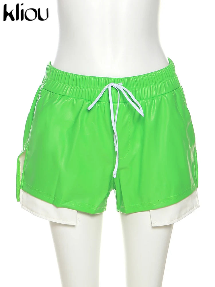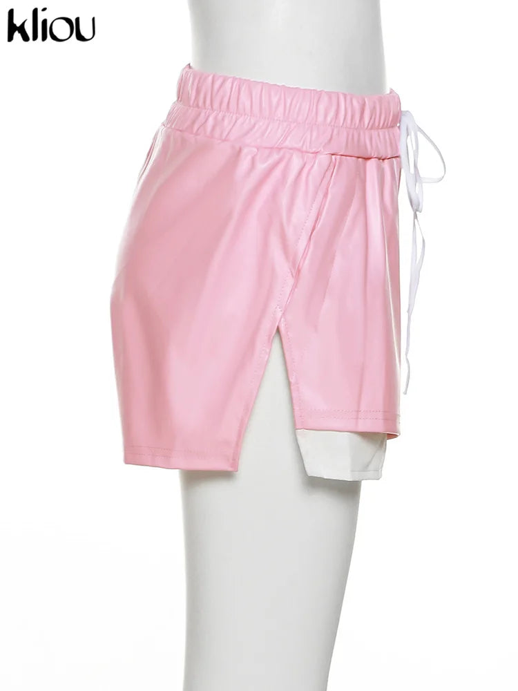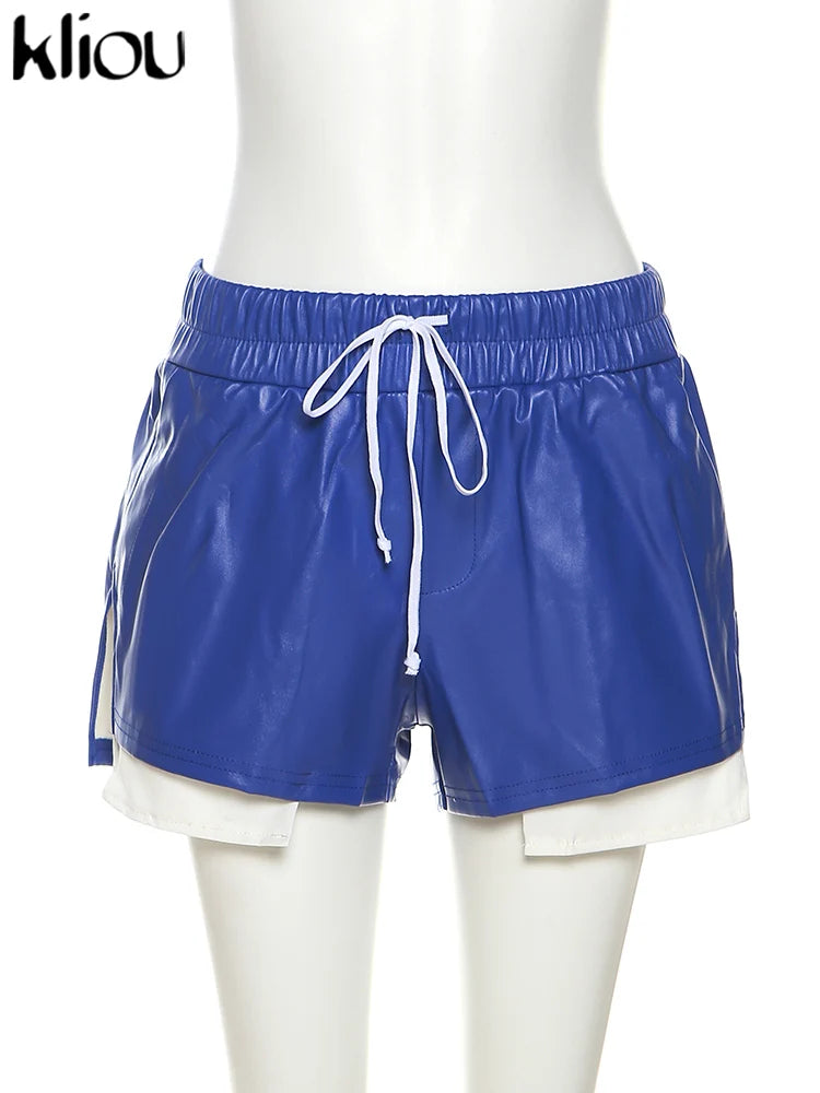 Kliou Faux PU Leather Patchwork Shorts Women Casual Summer Loose Bandage Elastic Waist Slit All-Match Bottoms Leisure Clothing