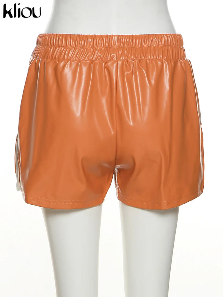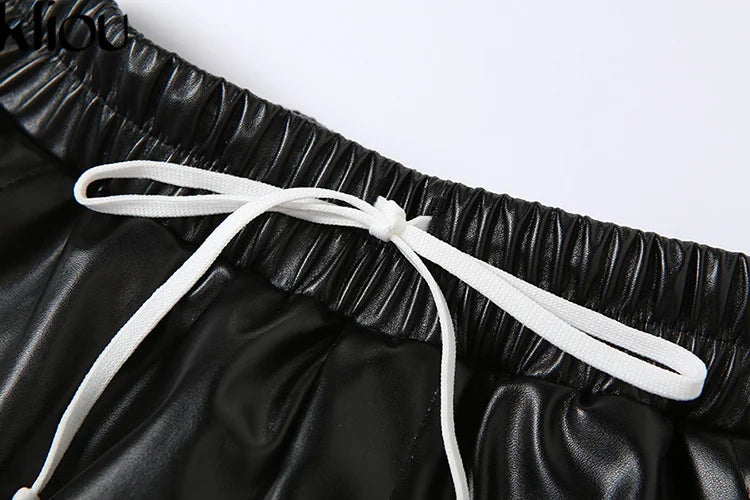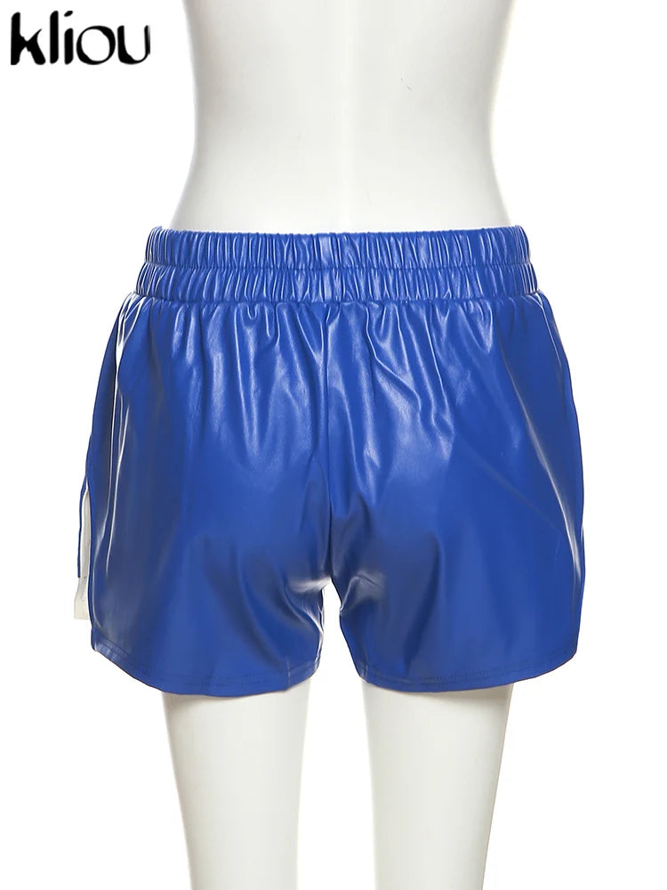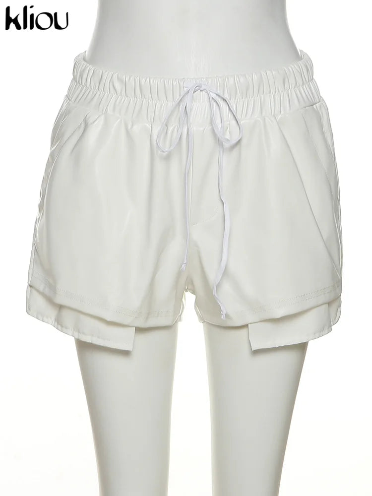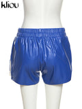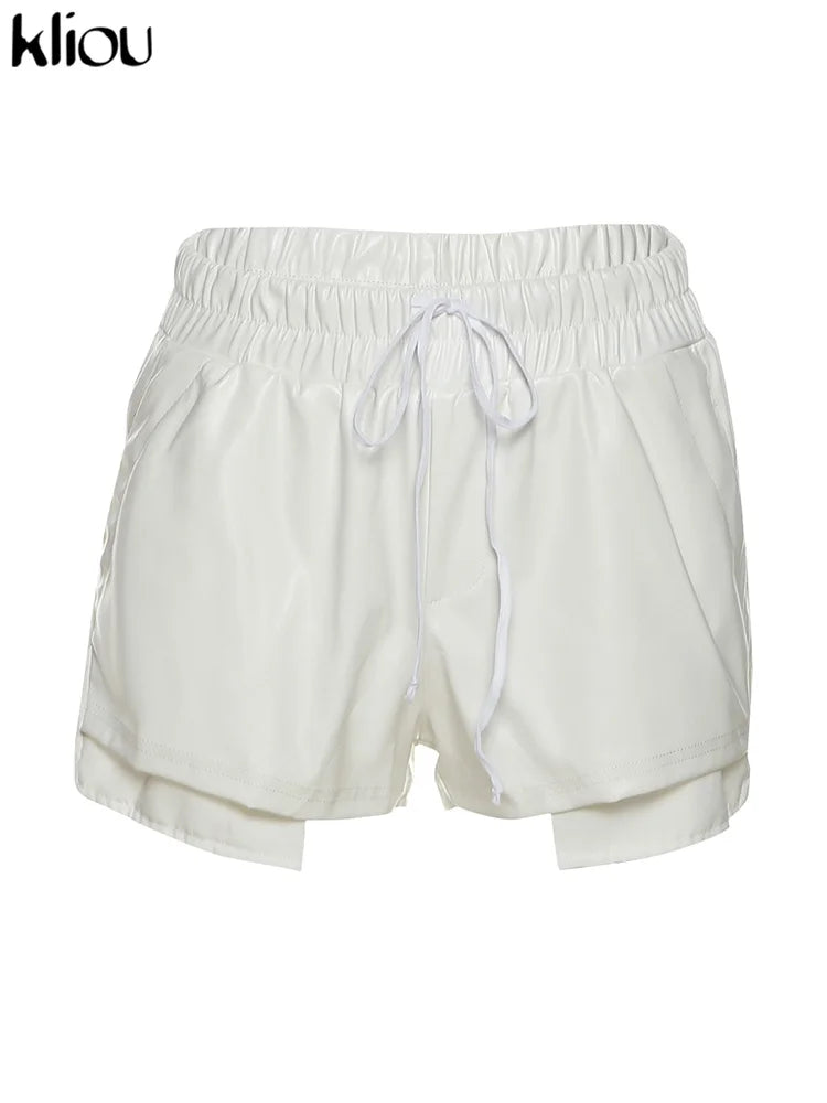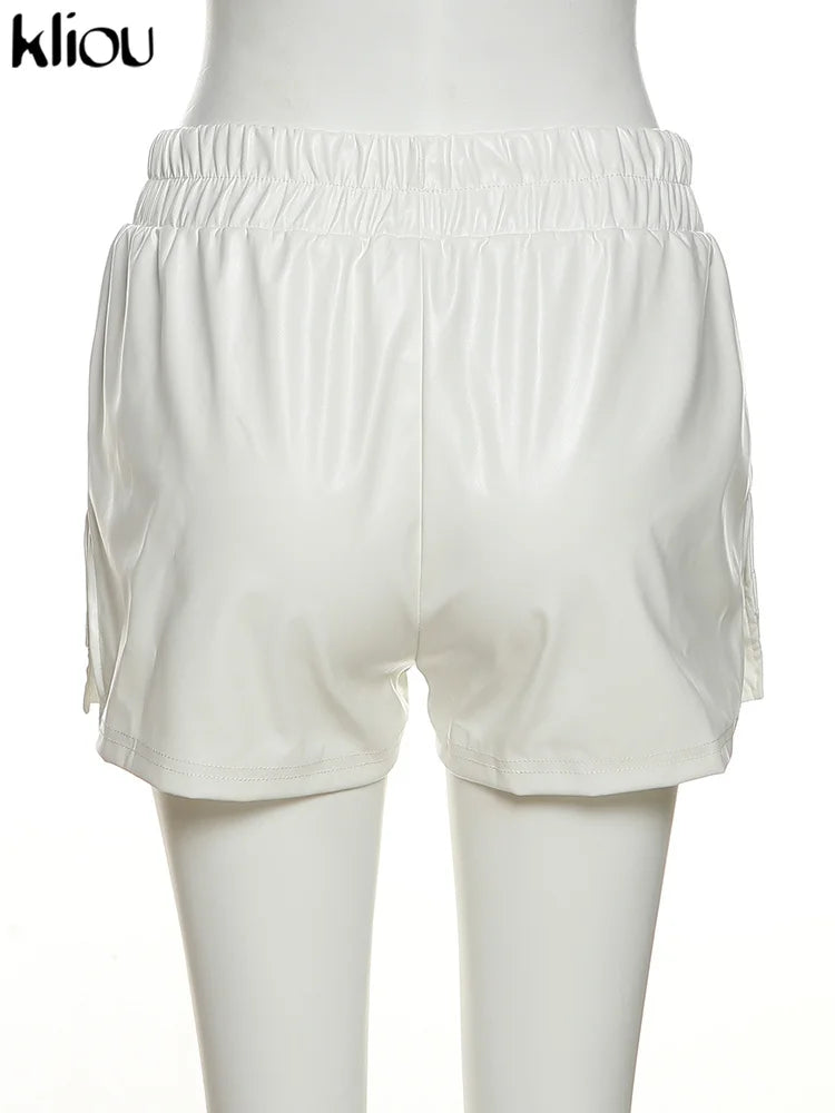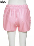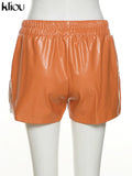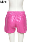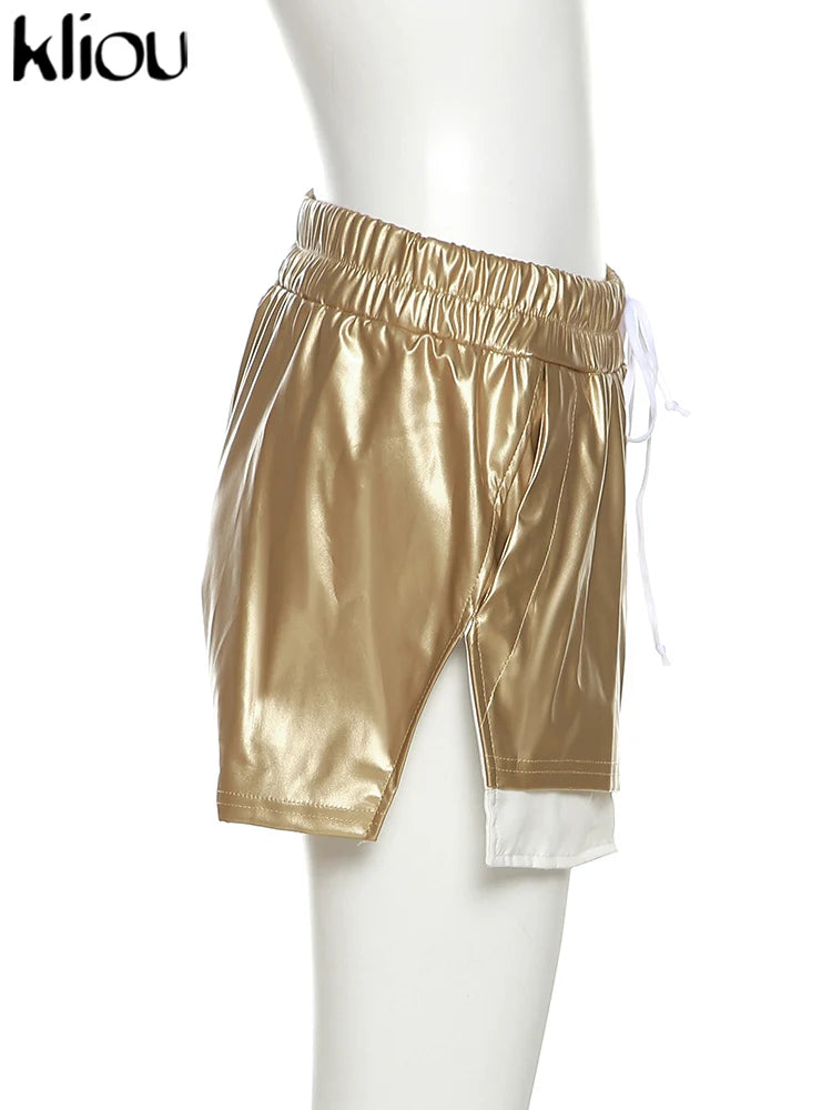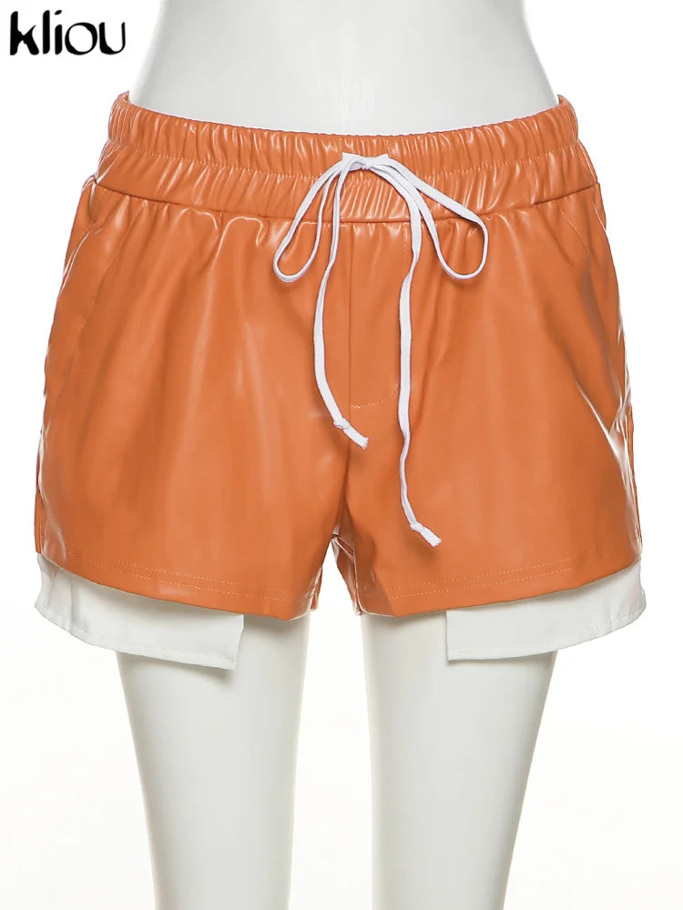 Kliou Faux PU Leather Patchwork Shorts Women Casual Summer Loose Bandage Elastic Waist Slit All-Match Bottoms Leisure Clothing