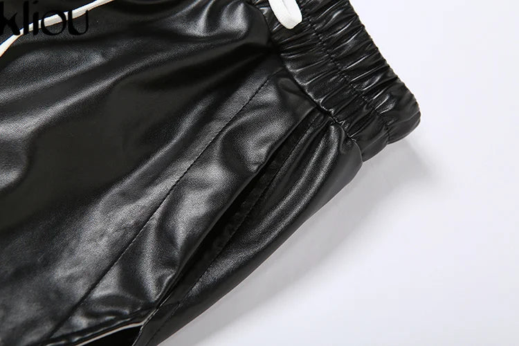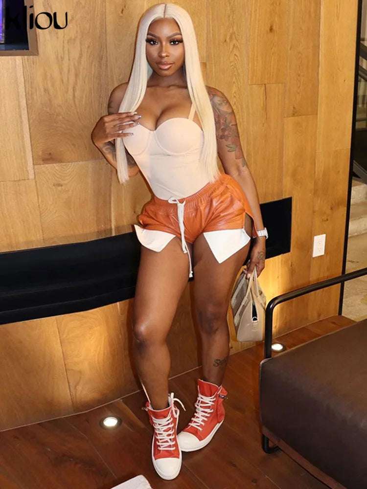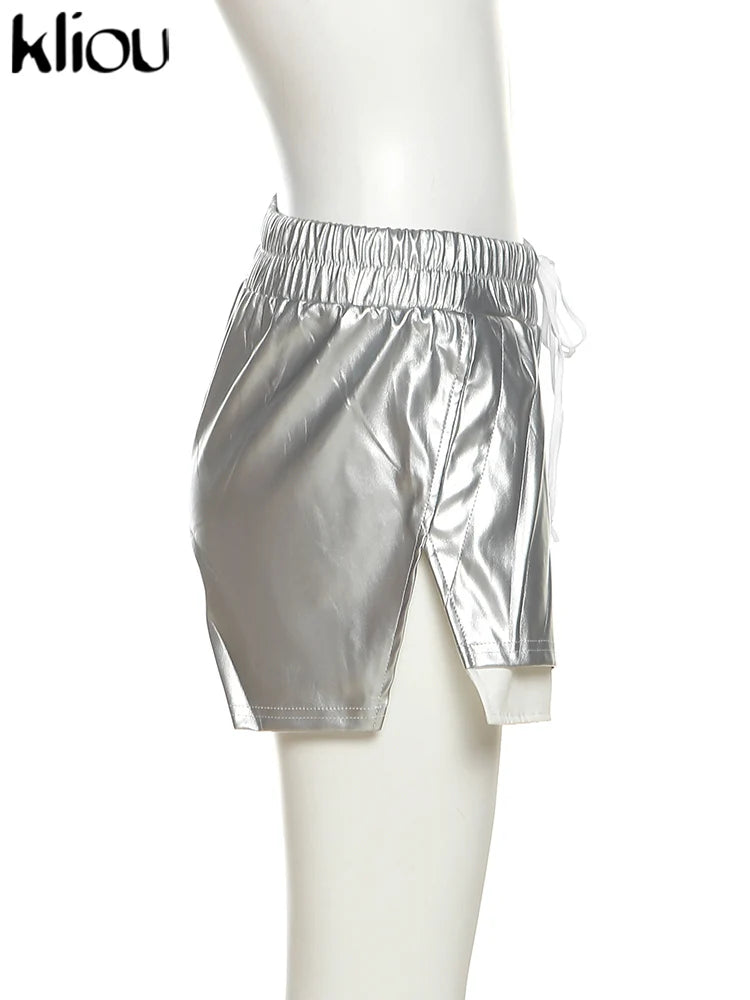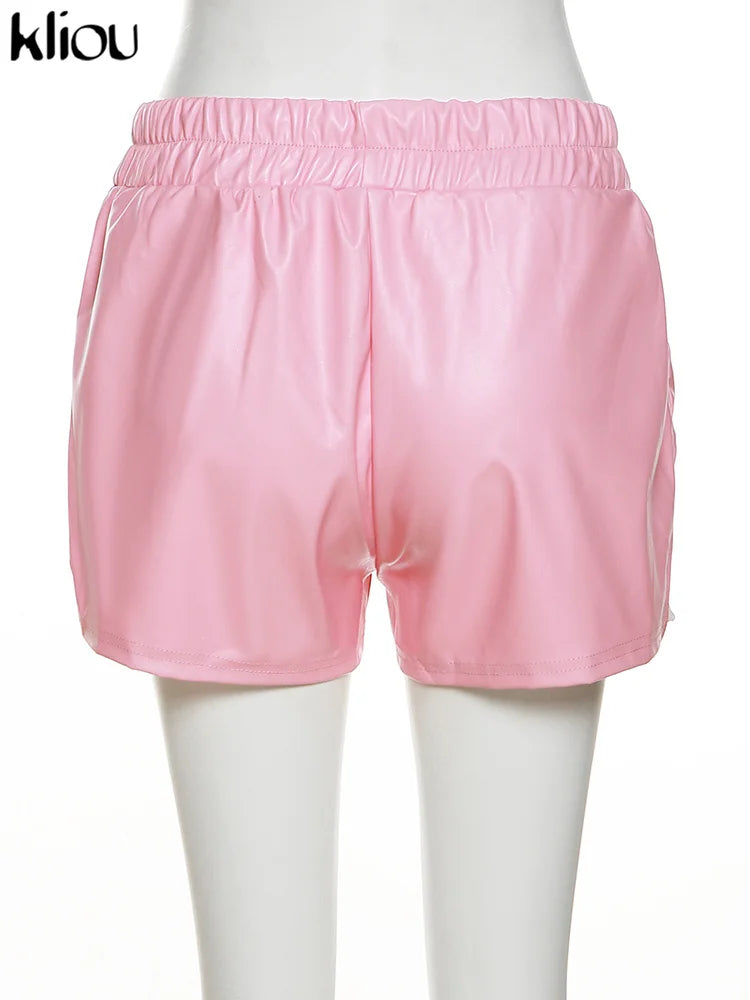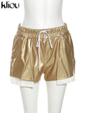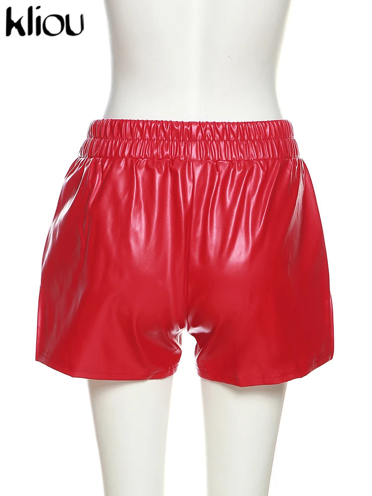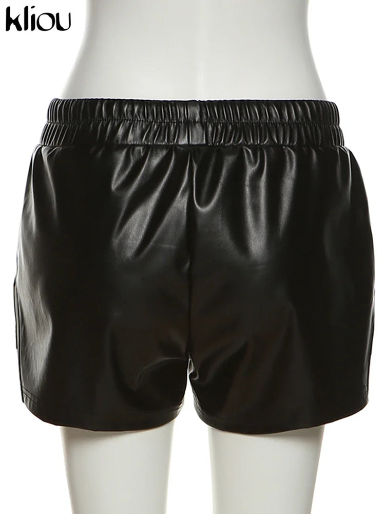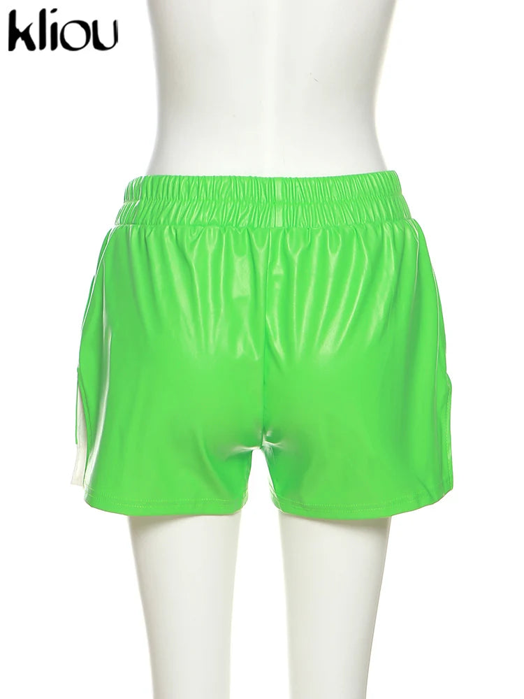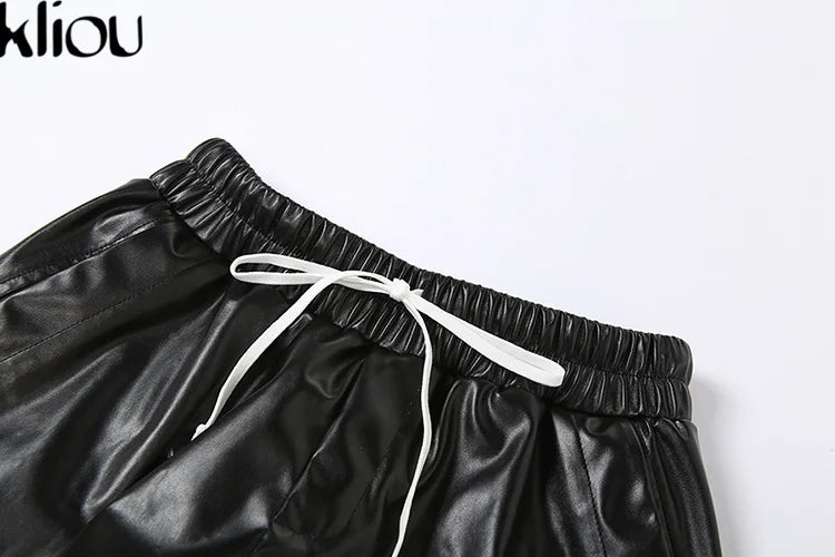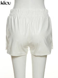 Kliou Faux PU Leather Patchwork Shorts Women Casual Summer Loose Bandage Elastic Waist Slit All-Match Bottoms Leisure Clothing