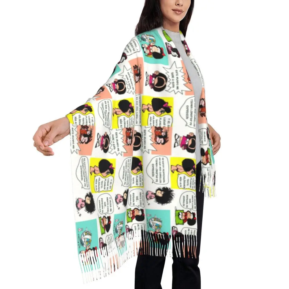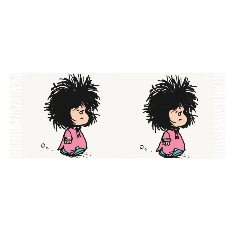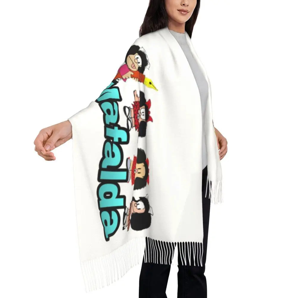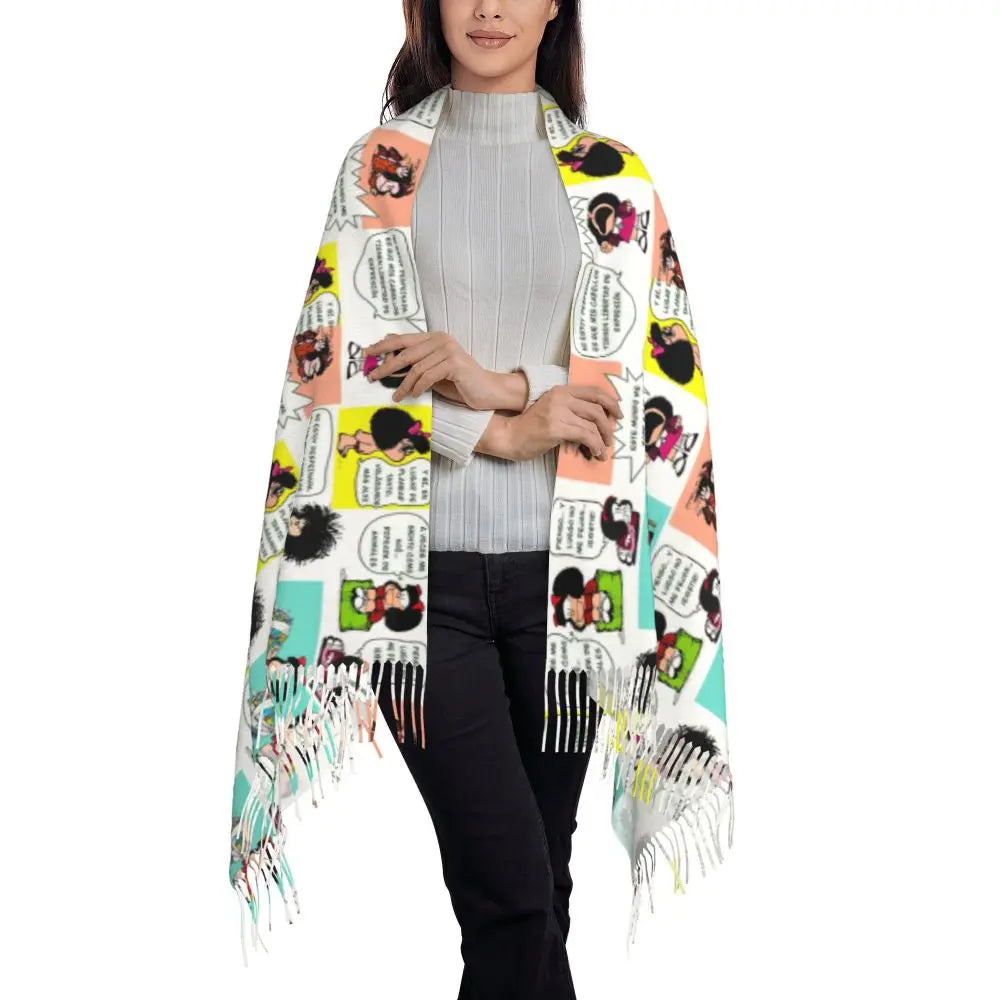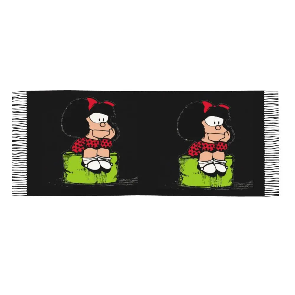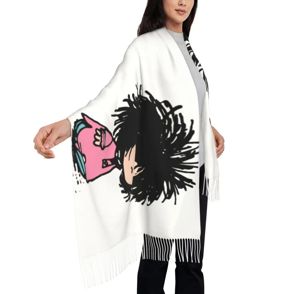 Ladies Long Cute Mafalda Scarves Women Winter Fall Soft Warm Tassel Shawl Wraps Argentine Cartoon Quino Comic Scarf