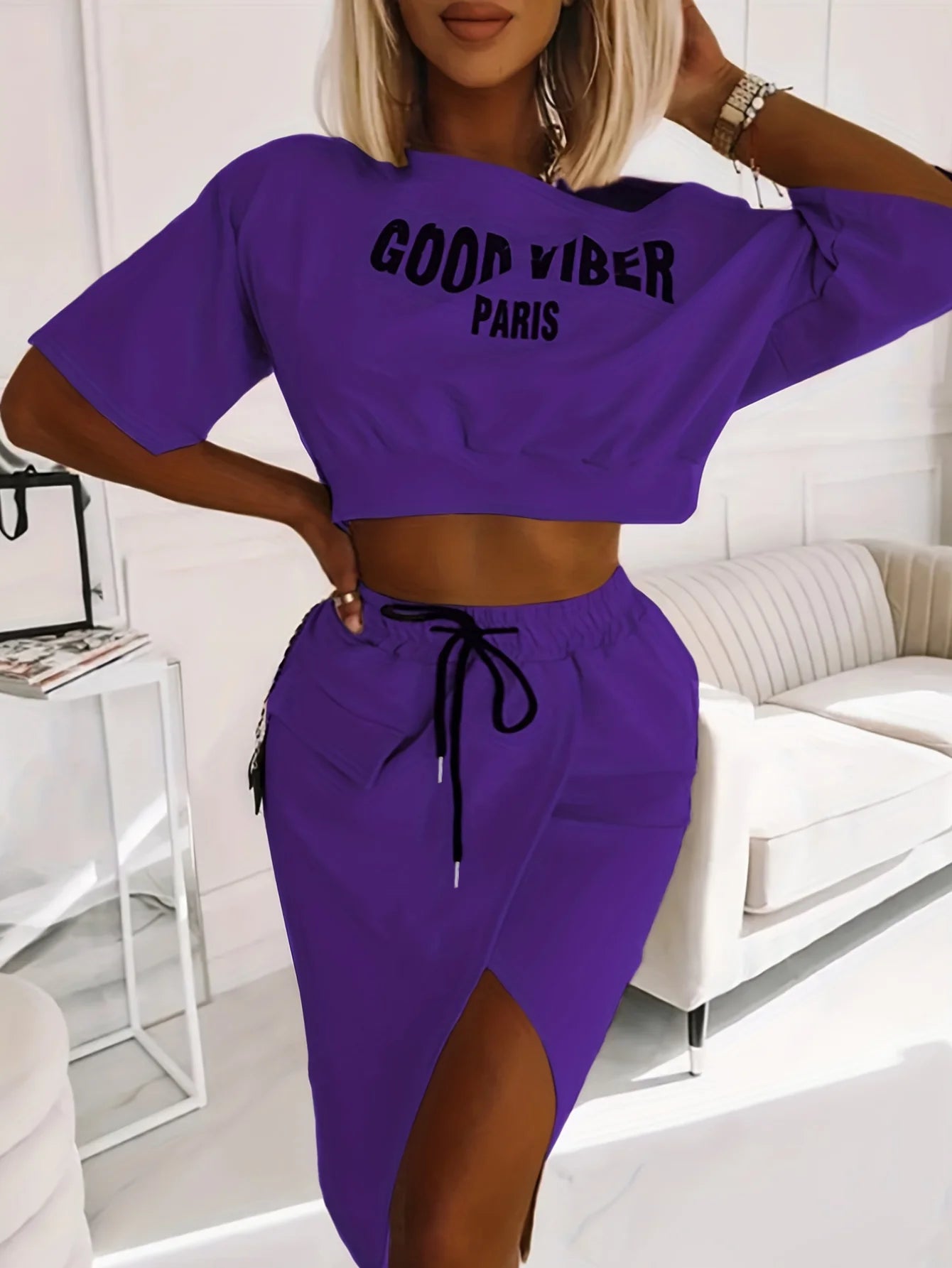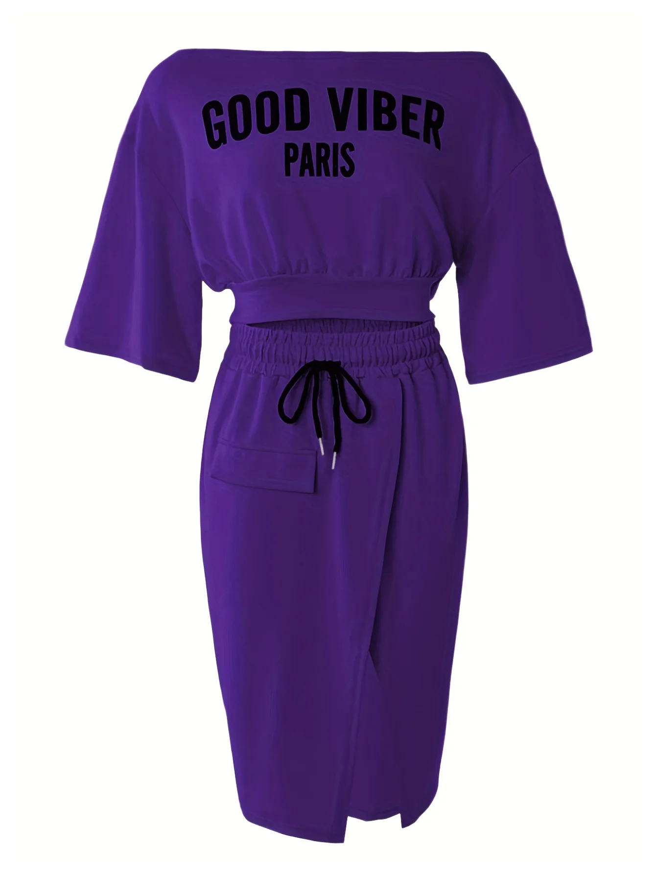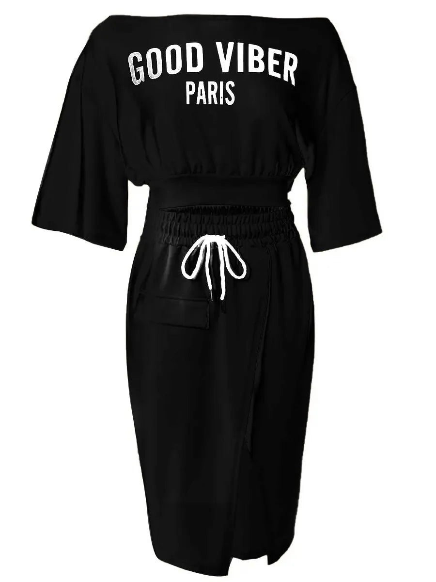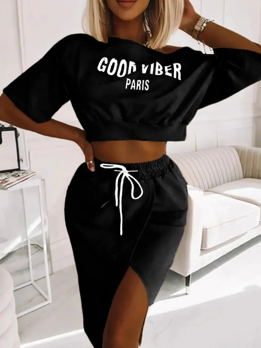 LW Plus Size Two Piece Good Viber One Shoulder Letter Print Set Crop Top+High Split Skirt Elegant Matching Outfits For Women