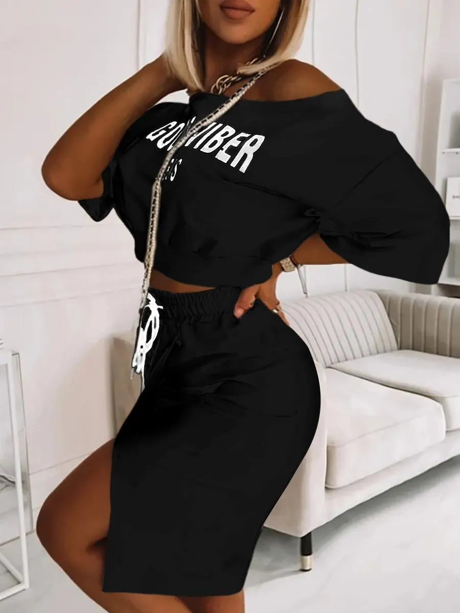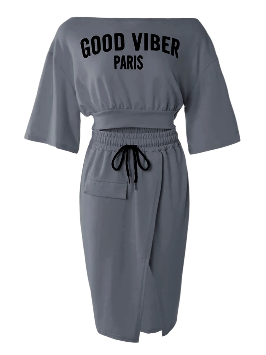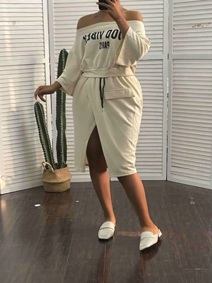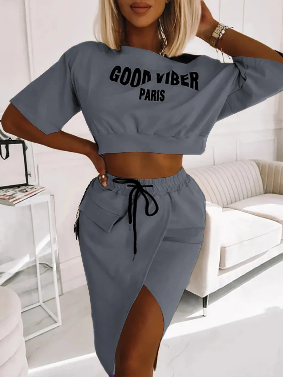 LW Plus Size Two Piece Good Viber One Shoulder Letter Print Set Crop Top+High Split Skirt Elegant Matching Outfits For Women