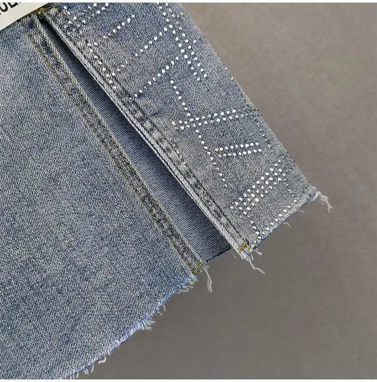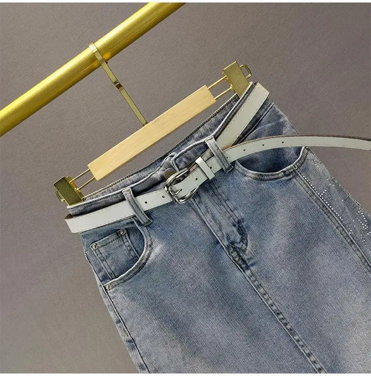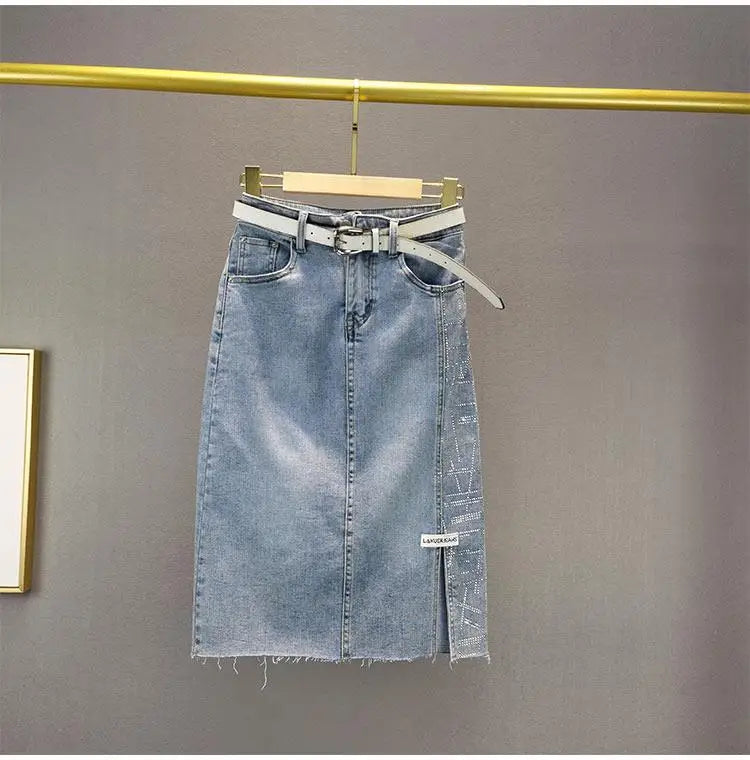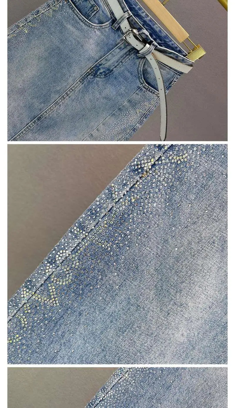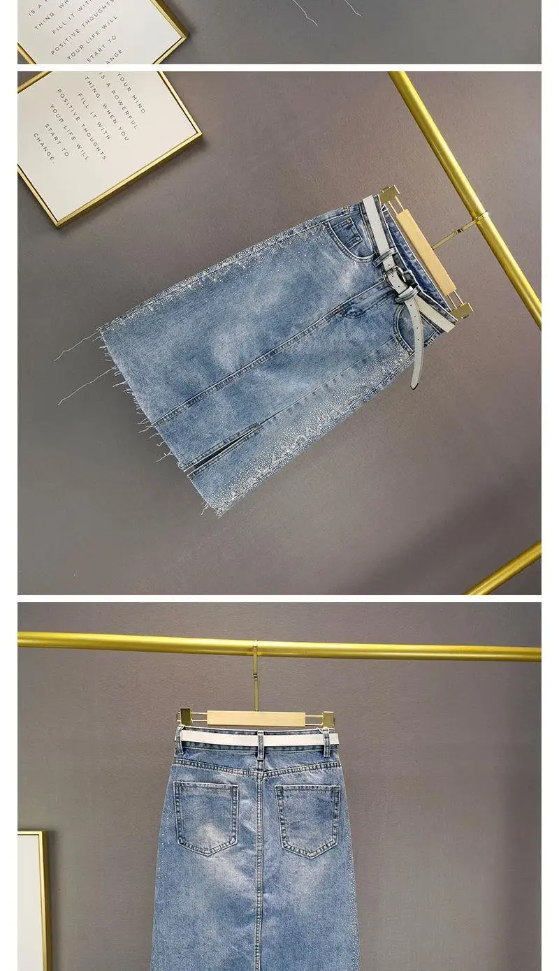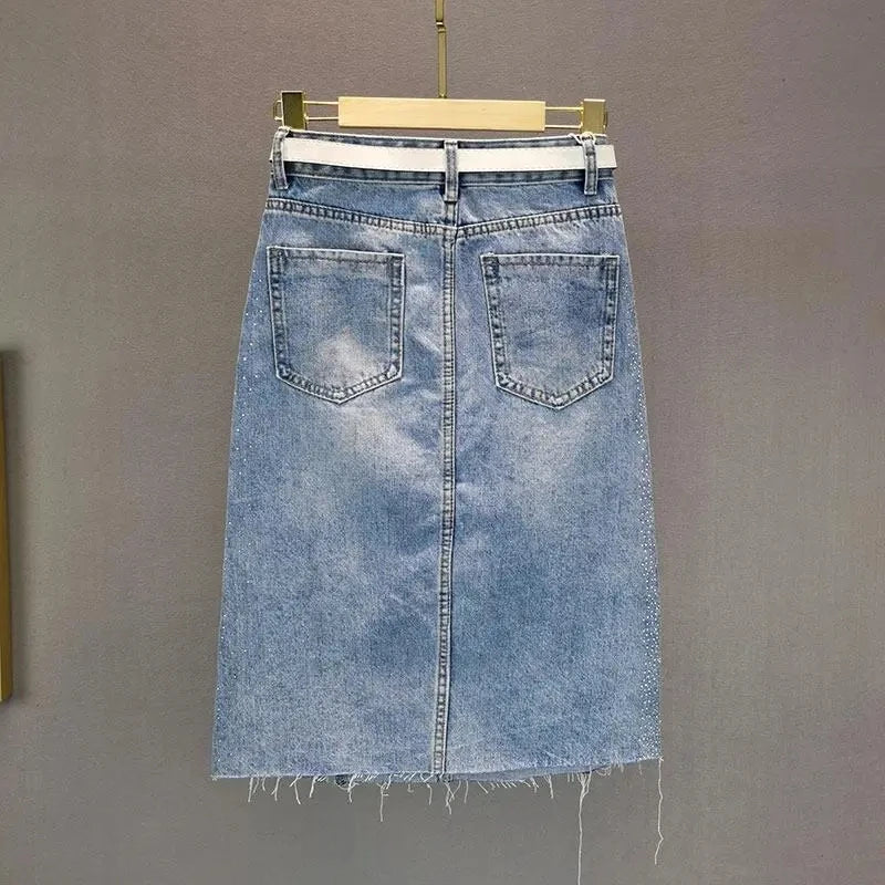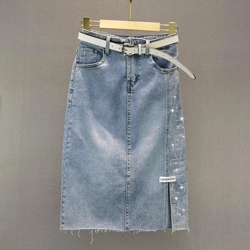 New Diamond inlay Split Vintage Casual Denim Skirt Female 2024 Summer Trend Fashion High Waist Slim Wrap Hip Half Skirt Women's