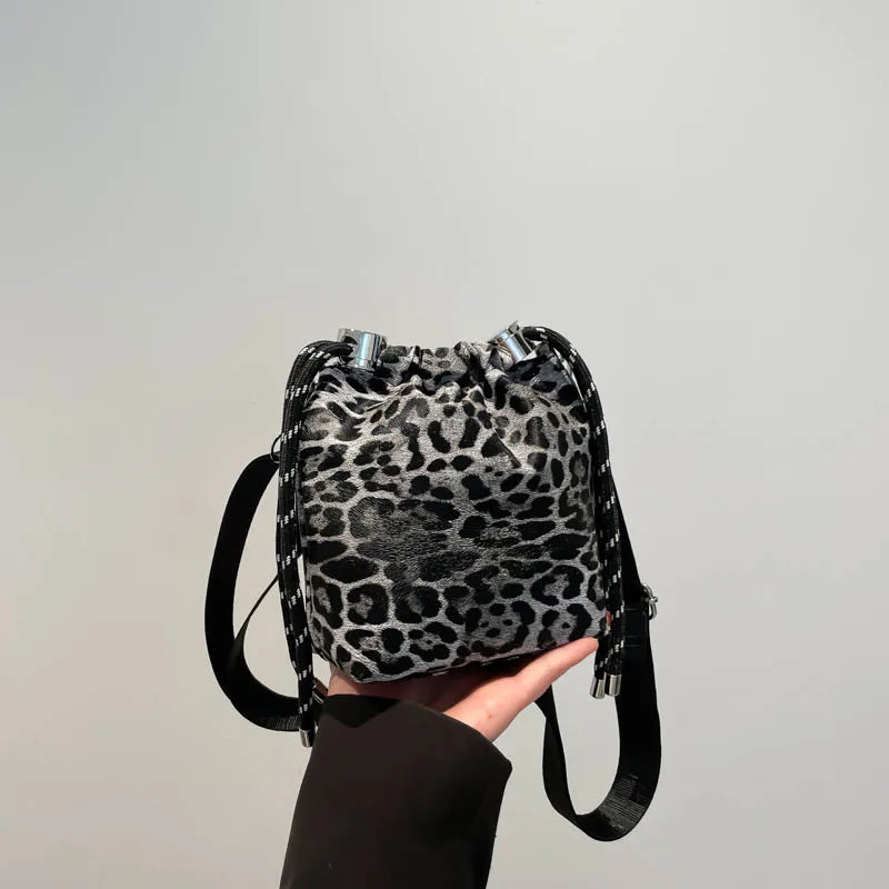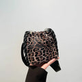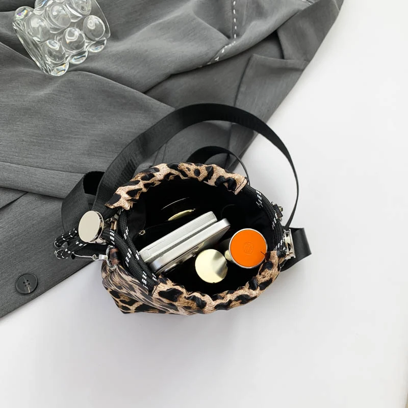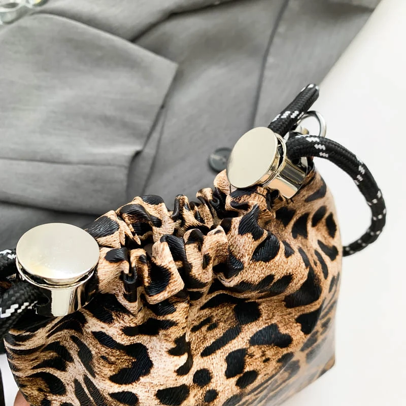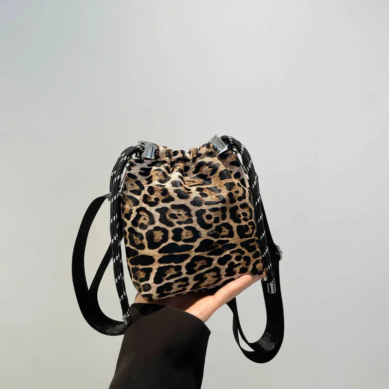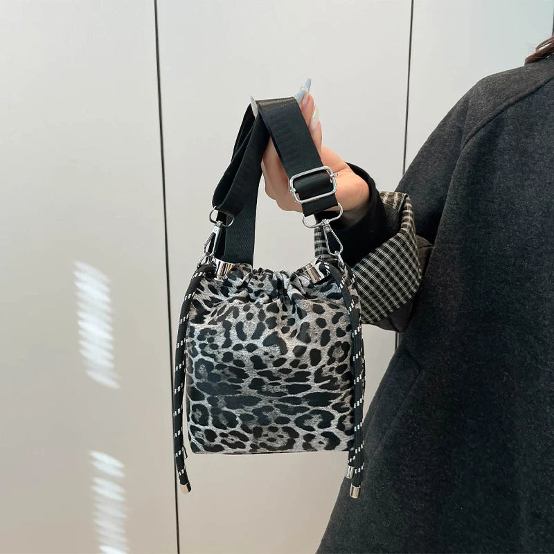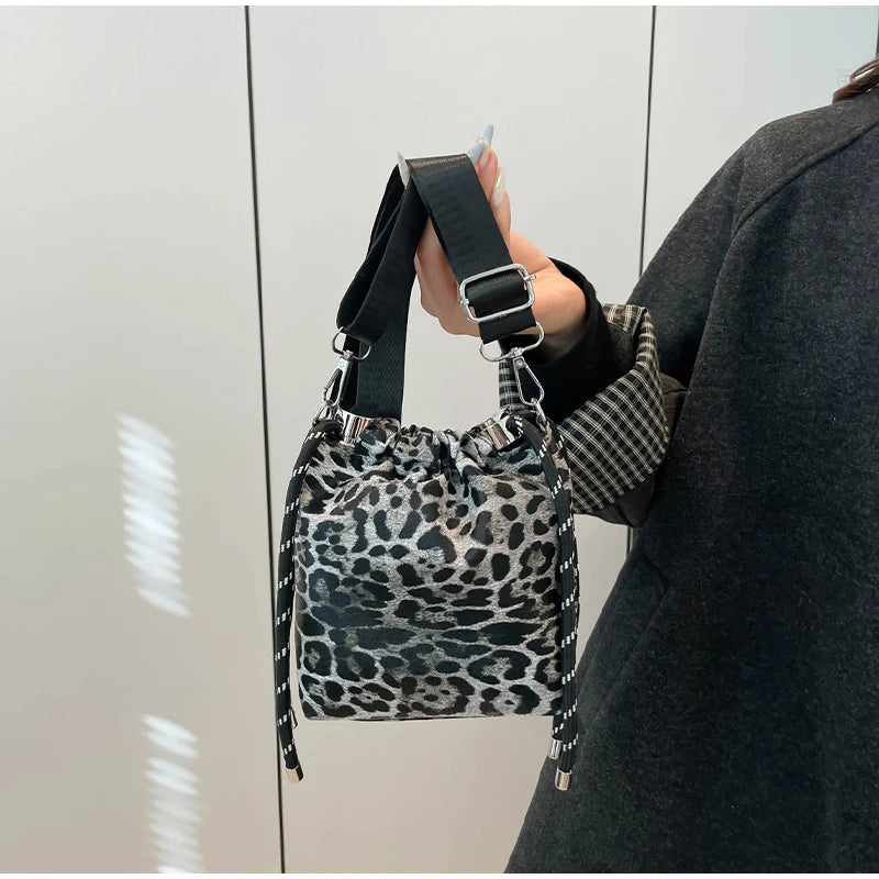 New Women's Mini Leopard Crossbody Bag Pu Leather Bucket Bag Drawstring Shoulder Bag Wide Strape Women's Bags Large Storage Bags