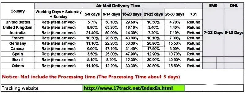 2. tems will be shipped by Hong Kong Air Mail or China Post Air Mail Service. Normally it will take you about 10-25 business days (exclude Saturday & Sunday, Public Holiday) to receive your items. Please contact us first if you don't receive item for more than 30 days. Thanks for your understanding. 3. We also support fast shipment by "EMS" "DHL" "UPS" "TNT" "Fedex" (need additional cost).