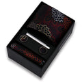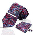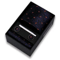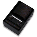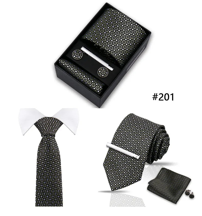 Set includes necktie, pocket square, cufflinks, tie clip, black gift box