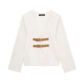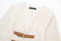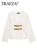 TRAFZA Retro Leather Buckle Woolen Coat Women Fashion Solid V Neck Long Sleeve Beige Jacket Autumn Spring Chic Female Streetwear