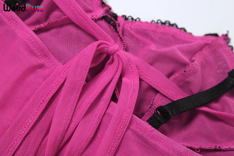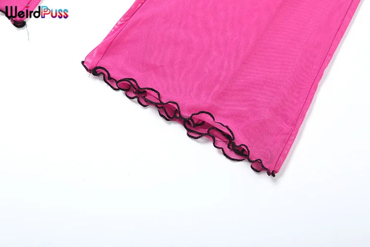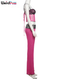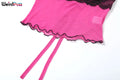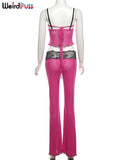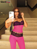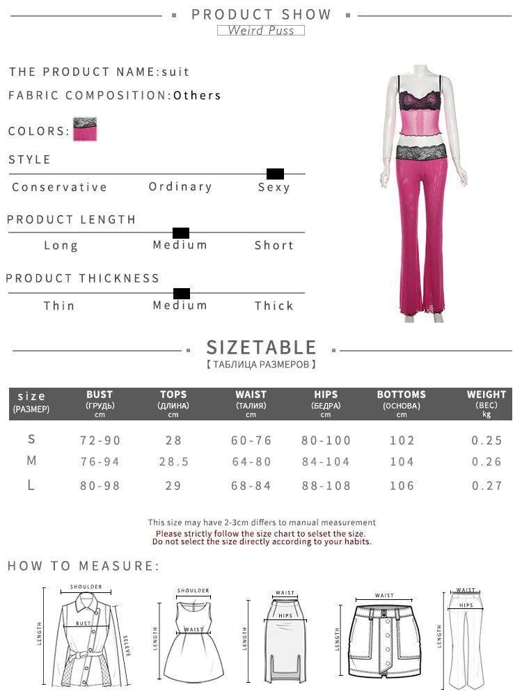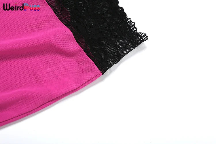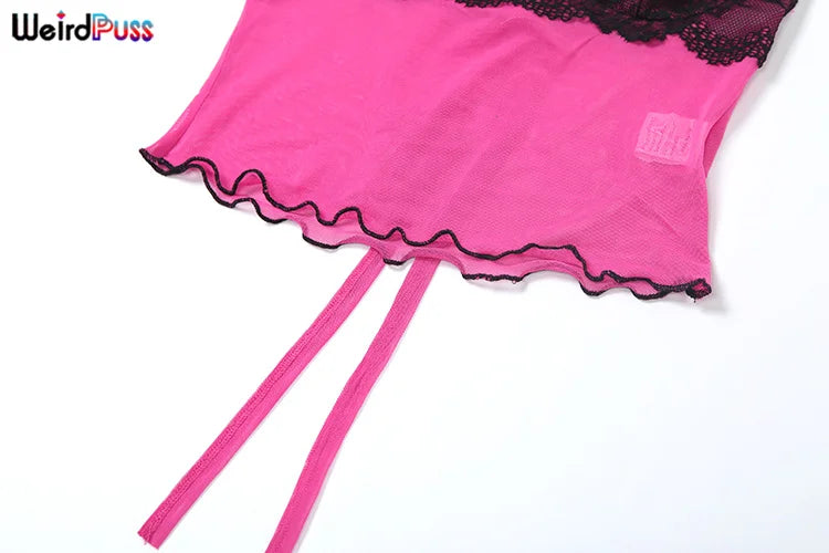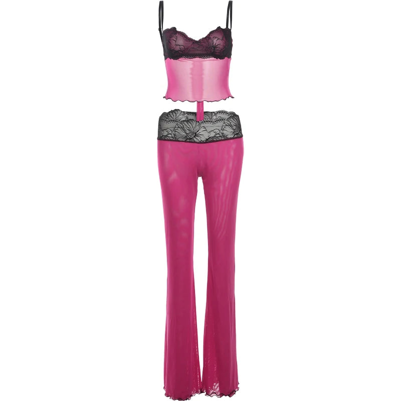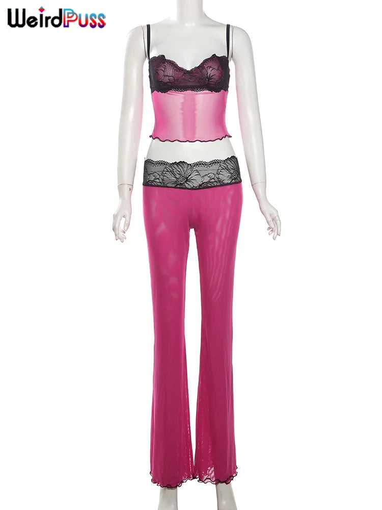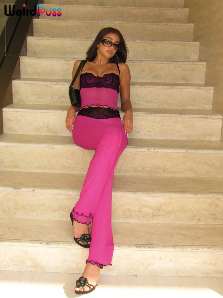 Weird Puss Patchwork Lace 2piece Sets Woman Summer Sexy Fungus Trim Spaghetti-Strap Tops+Chic Tierred Pants Party Skinny Outfits
