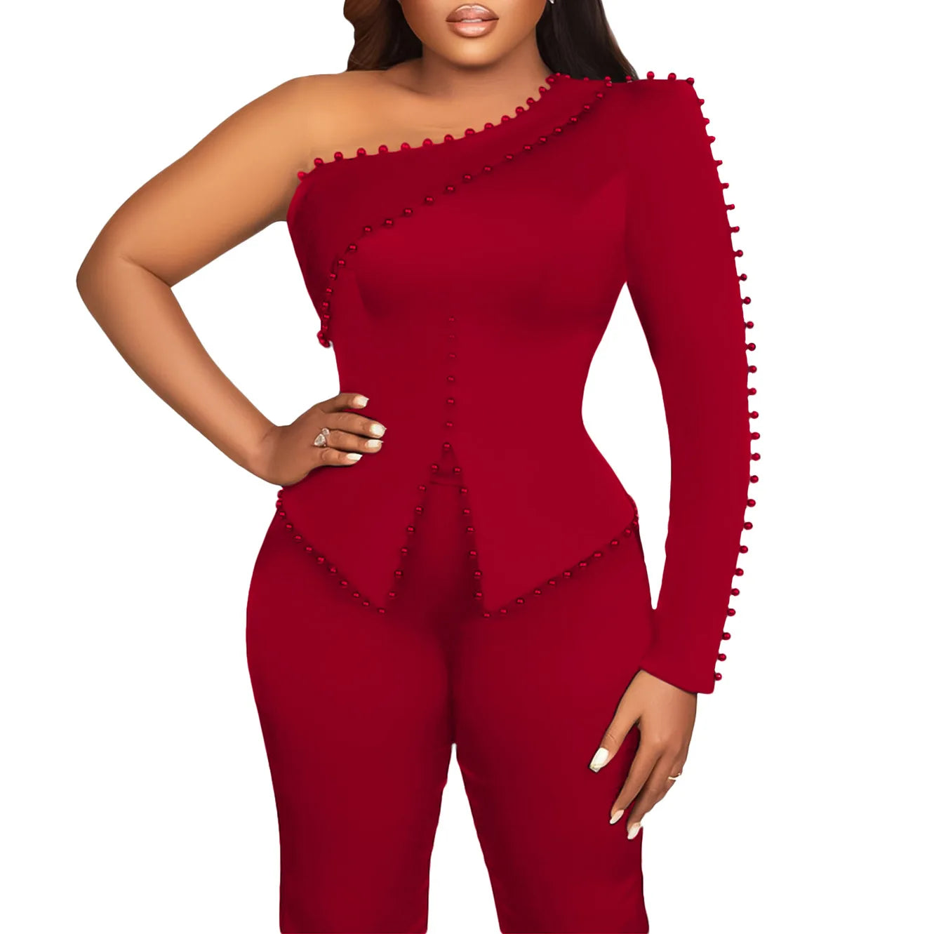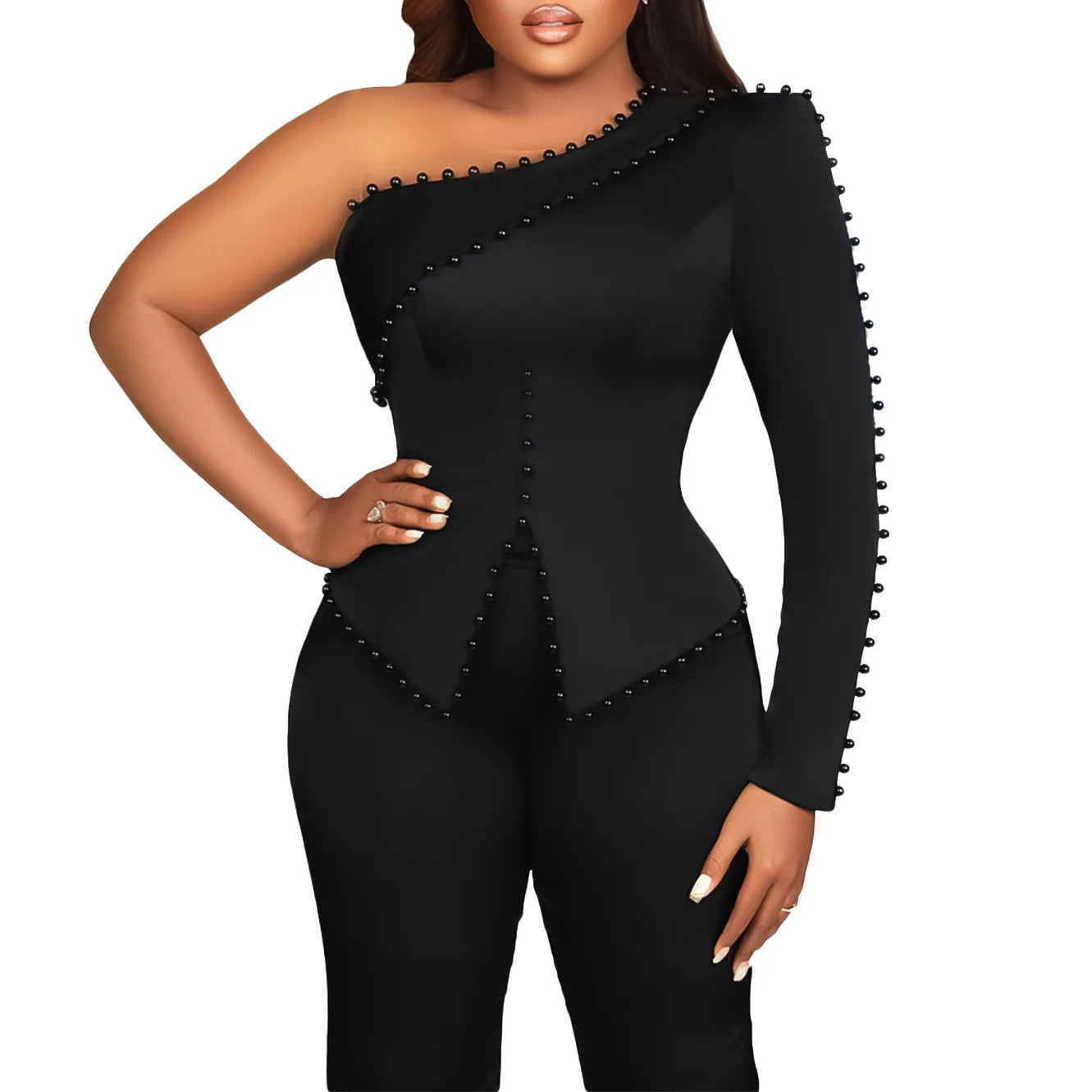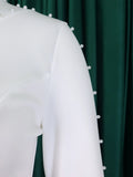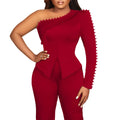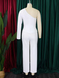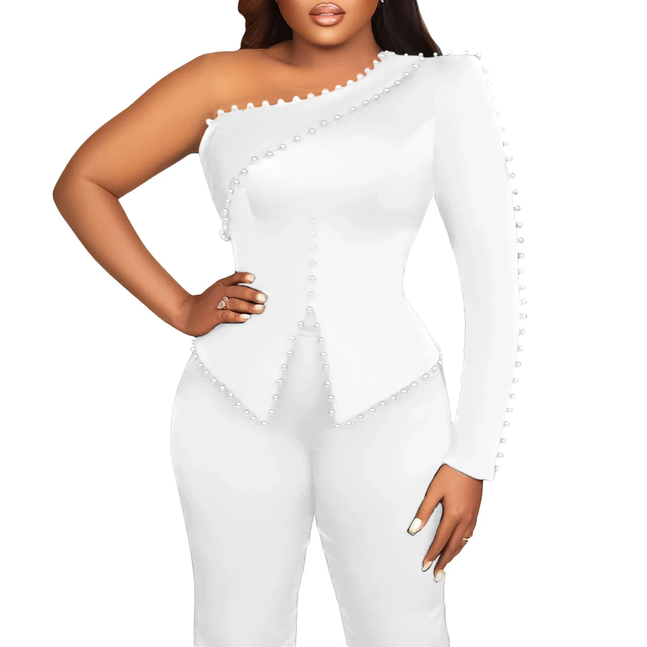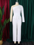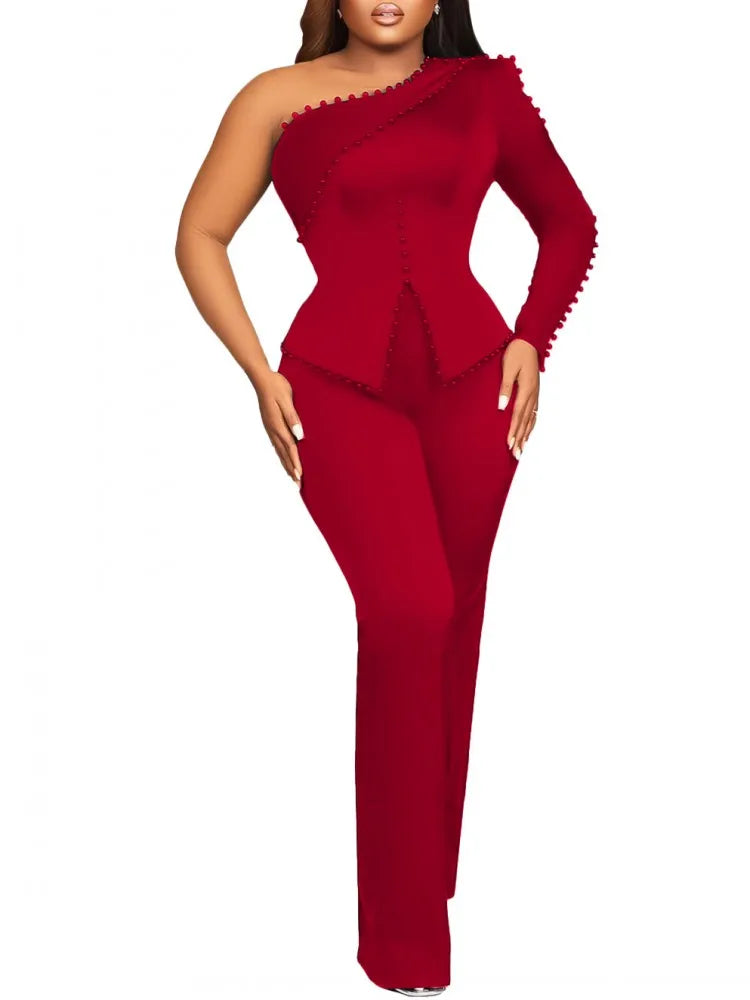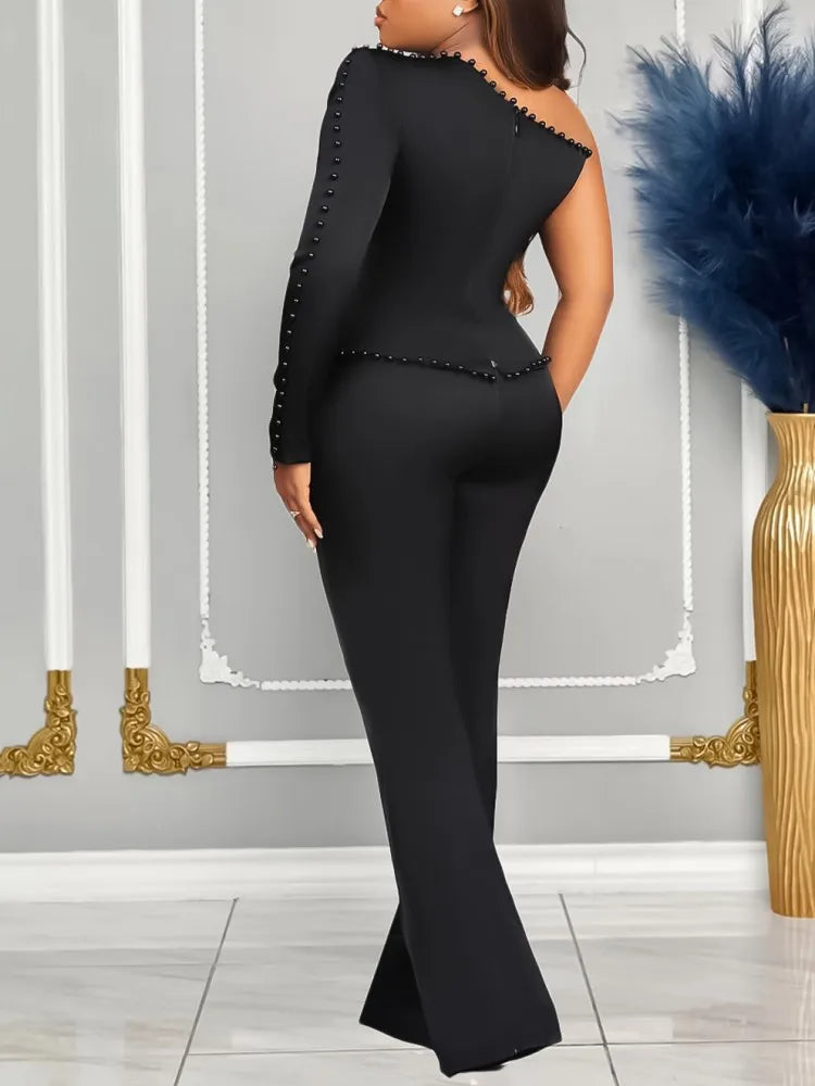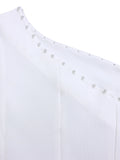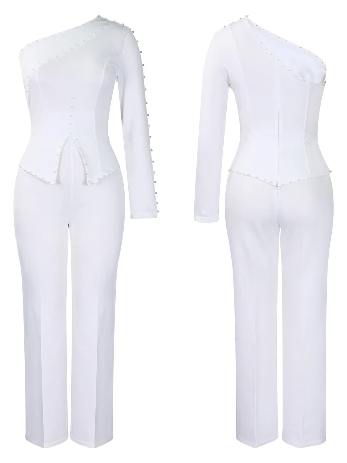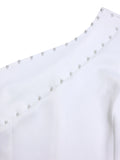White 2 Piece Sets Women Outifits Autumn Slanted Shoulder Nail Bead Top Pants Two-piece Party Lady Matching Sets OL Fashion Suit