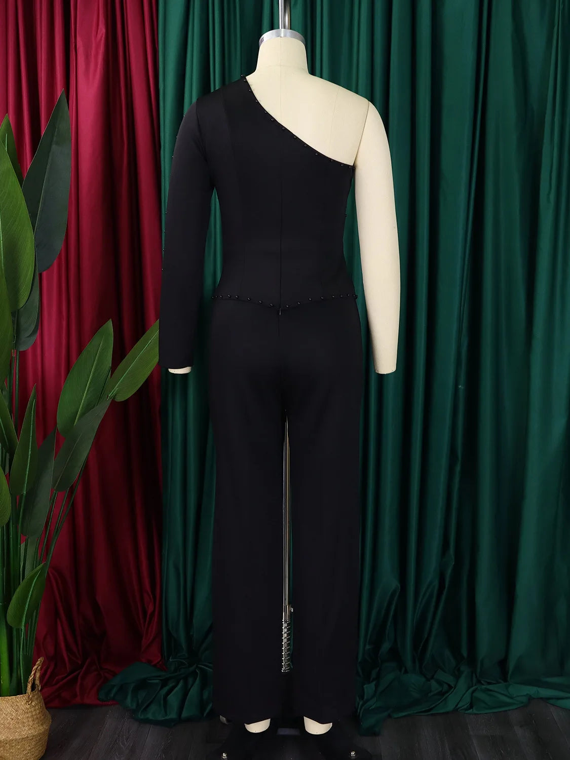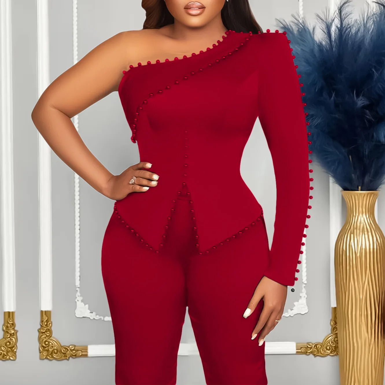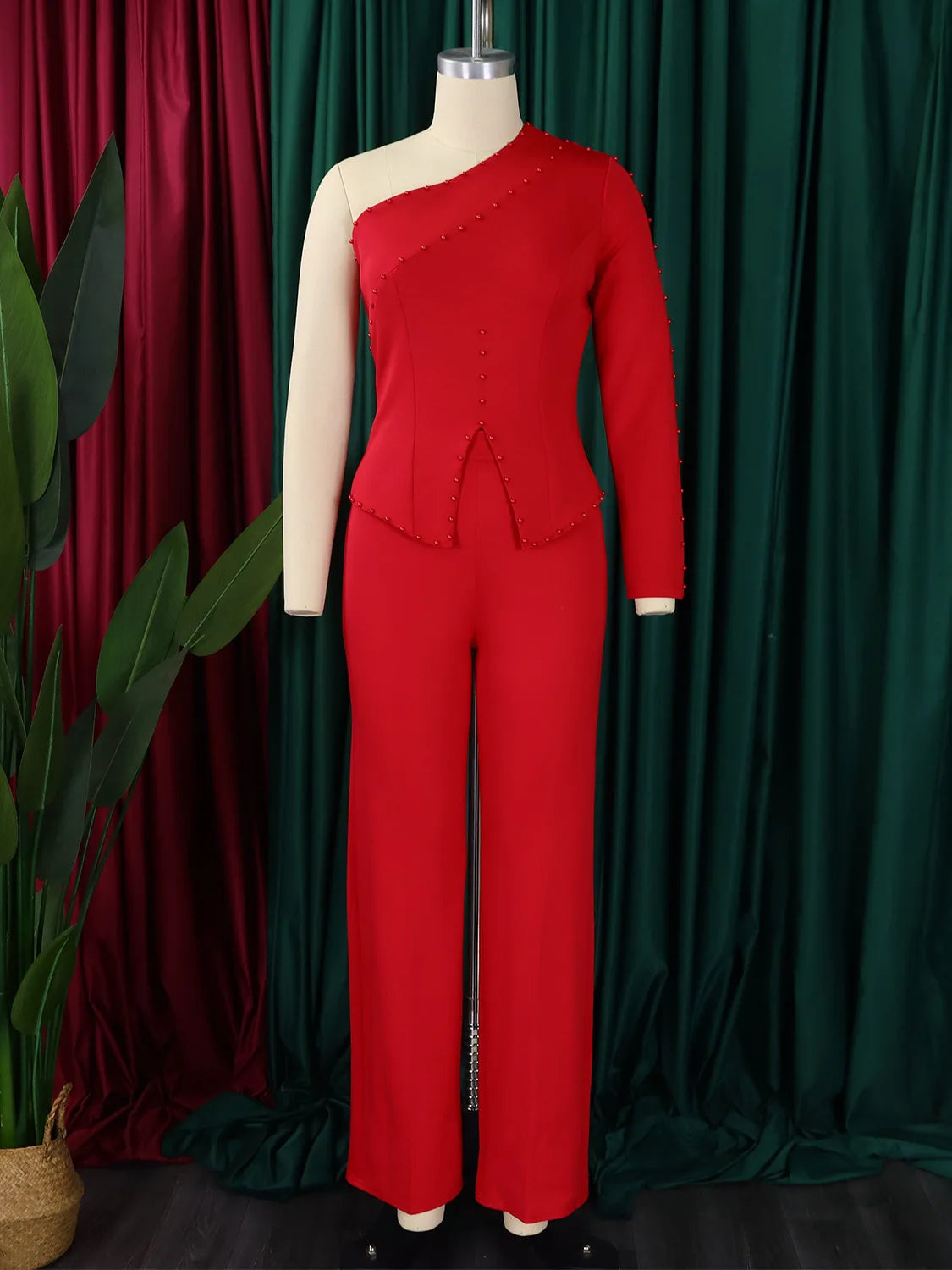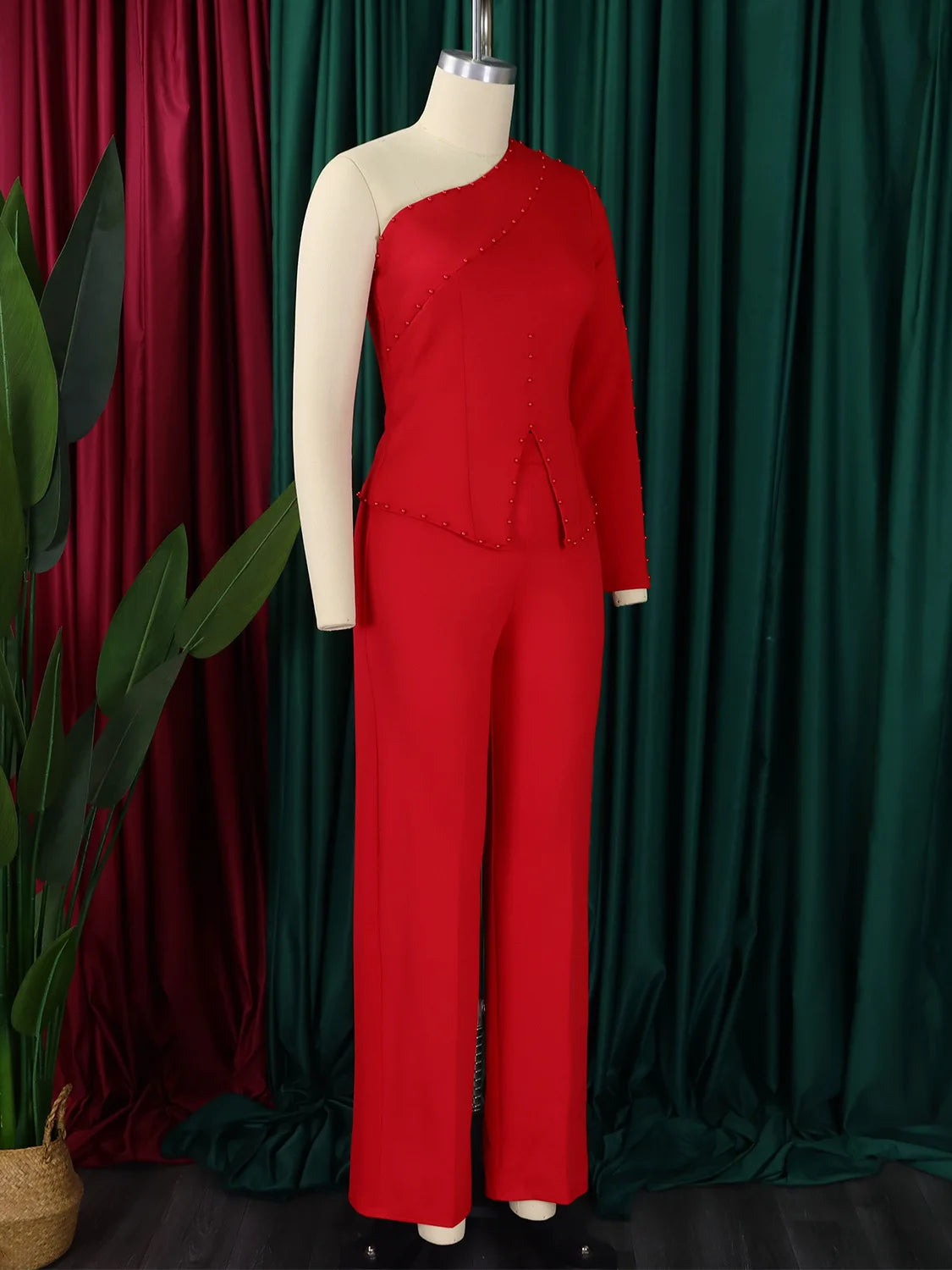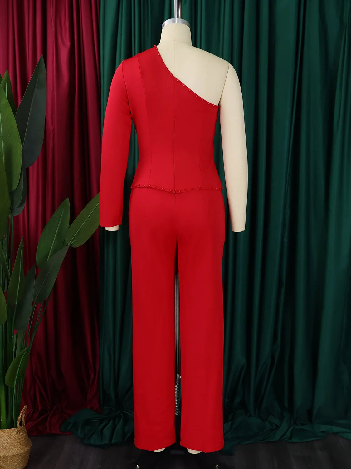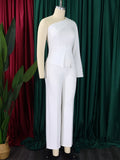 White 2 Piece Sets Women Outifits Autumn Slanted Shoulder Nail Bead Top Pants Two-piece Party Lady Matching Sets OL Fashion Suit