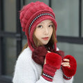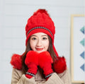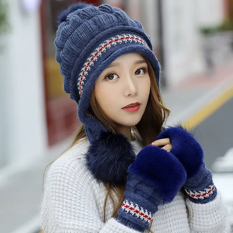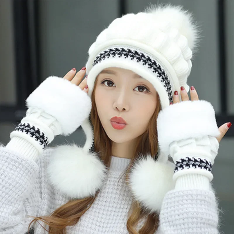 Women Girls Hat Gloves Set Keep Warm Knitted Fur Ball Decoration Cute Fashion Beanies Glove 2 Pieces Set For Winter