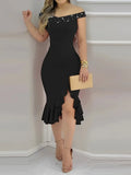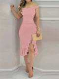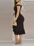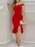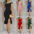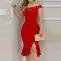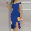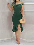 Womens Dresses New Summer Fashion Beaded Off Shoulder Ruffles Slit Hem Elegant Plain Short Sleeve Skinny Midi Party Dress