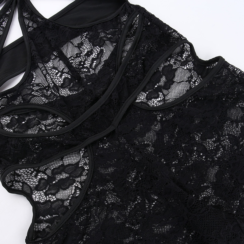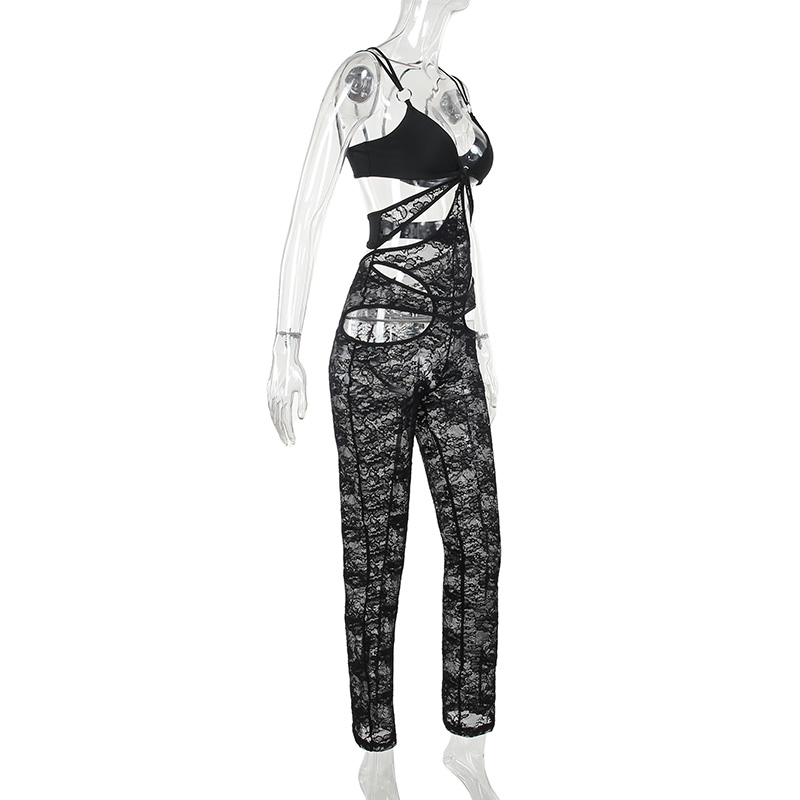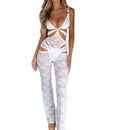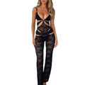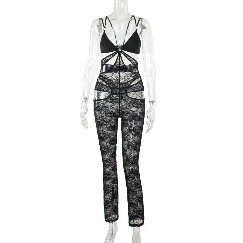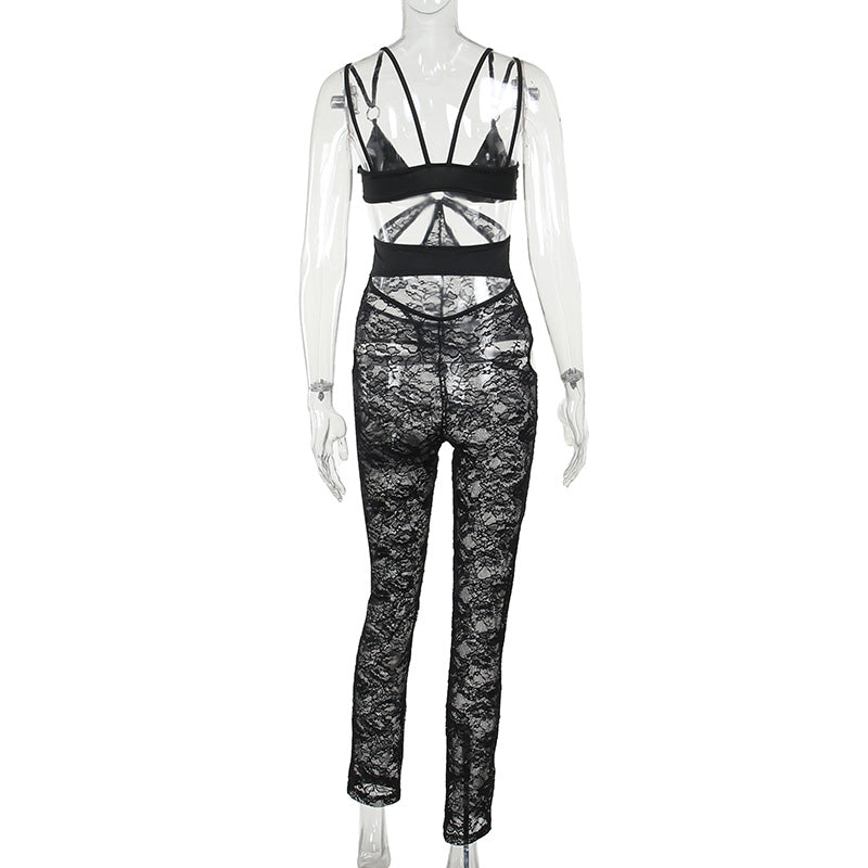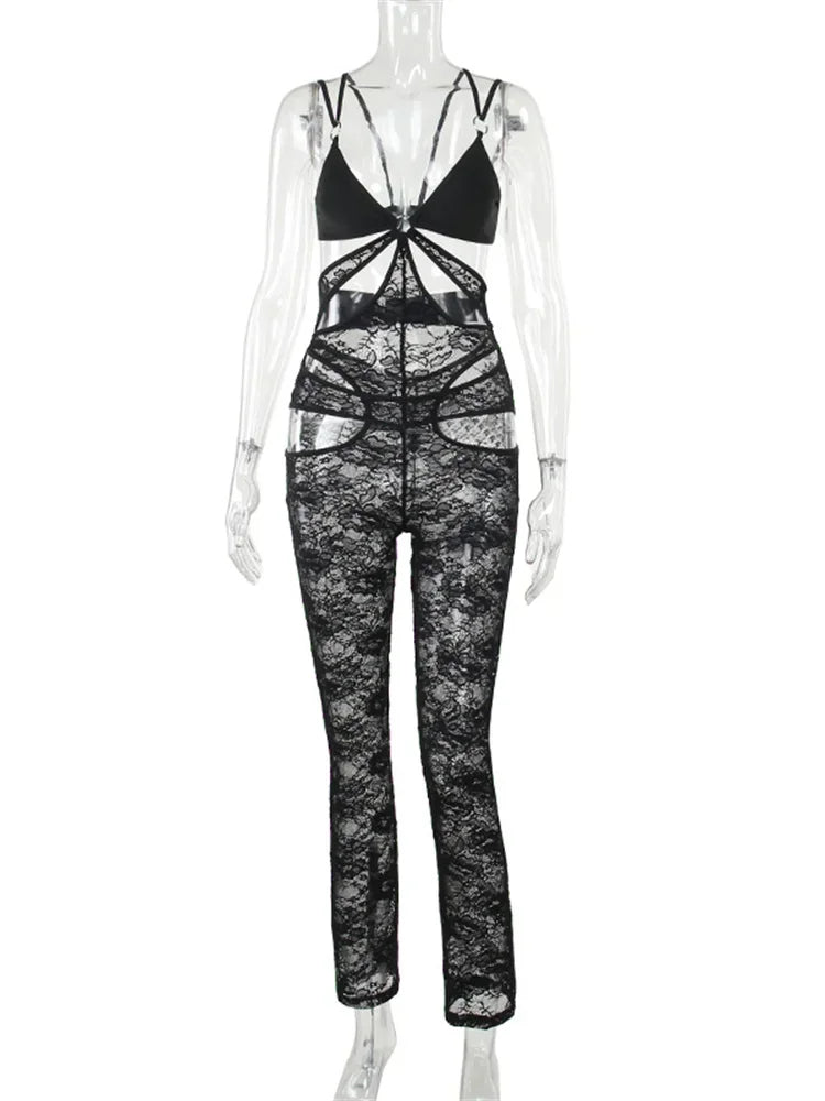 Women's Lace Sexy Jumpsuits Sleeveless Hollow Out Bodycon Long Romper Summer See Through Beach Club Overalls Streetwear Summer