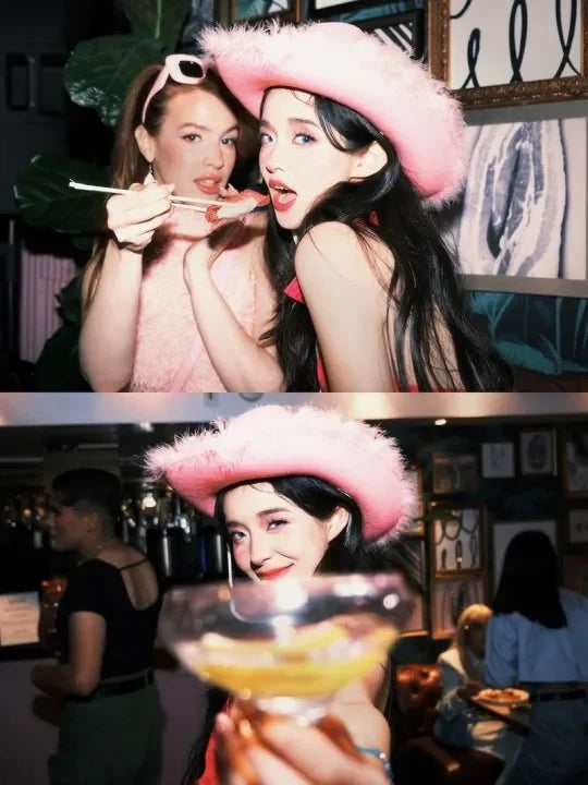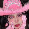 The new western cowboy hat with crown, pink western cowboy hat with feather cap and sequins, ladies stage hat, holiday fashion hat, party wide brim hat.