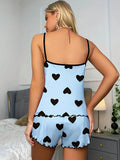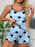 Womens Sexy Heart Print Pajama Set Cami Top Lettuce Trim Shorts Two Piece Sleepwear Loungewear Spaghetti Strap Contrast Trim