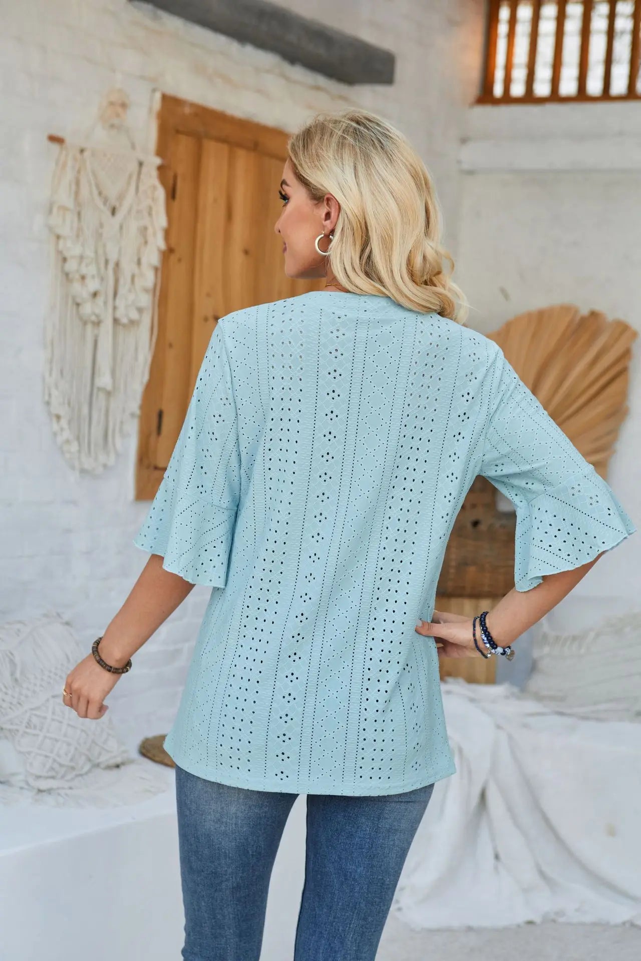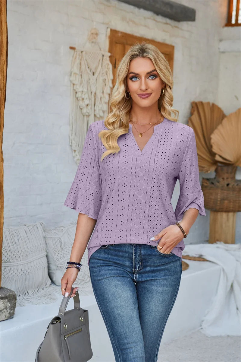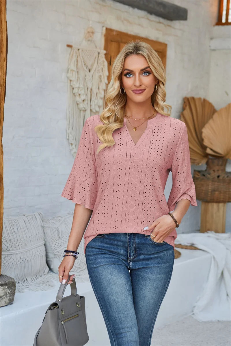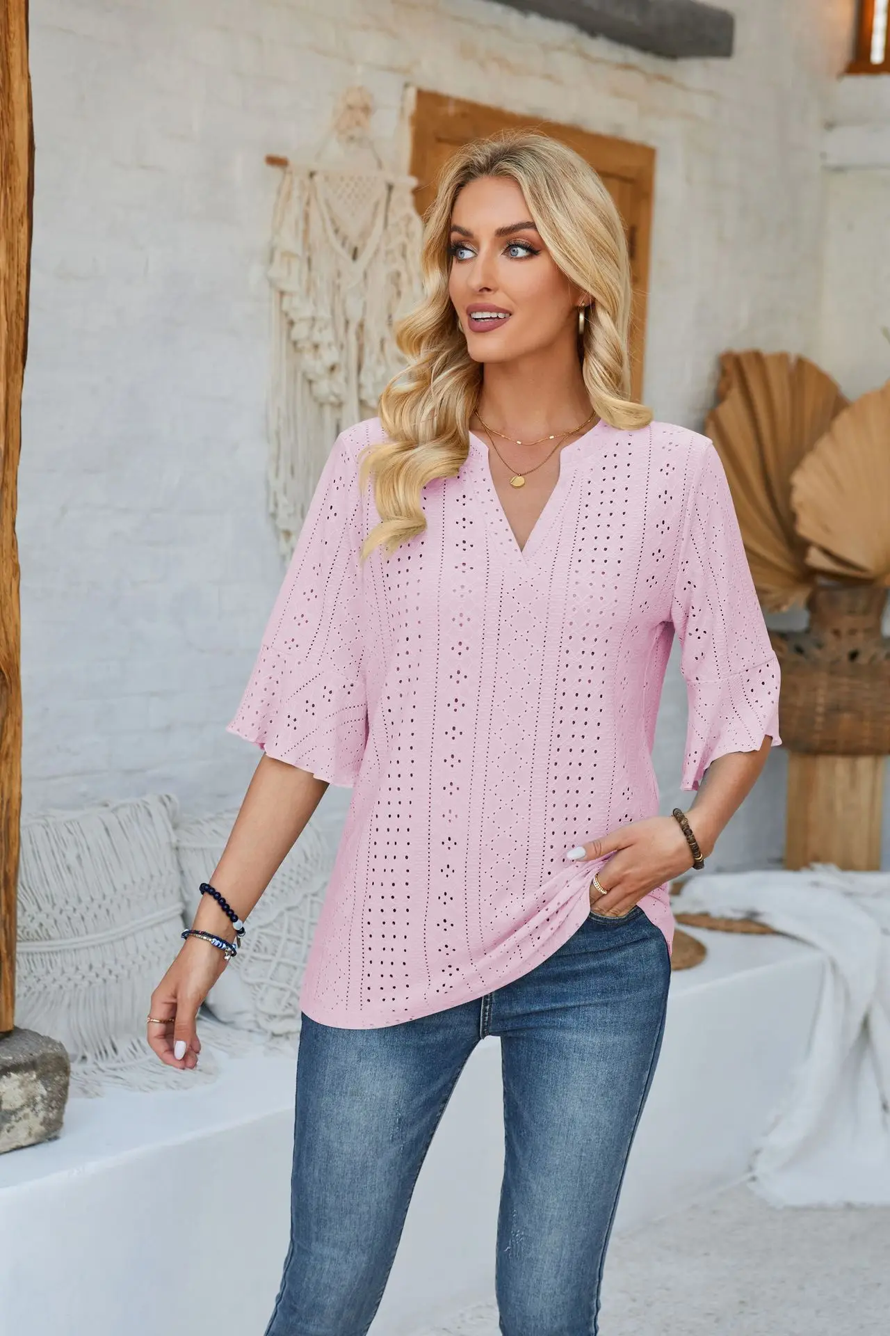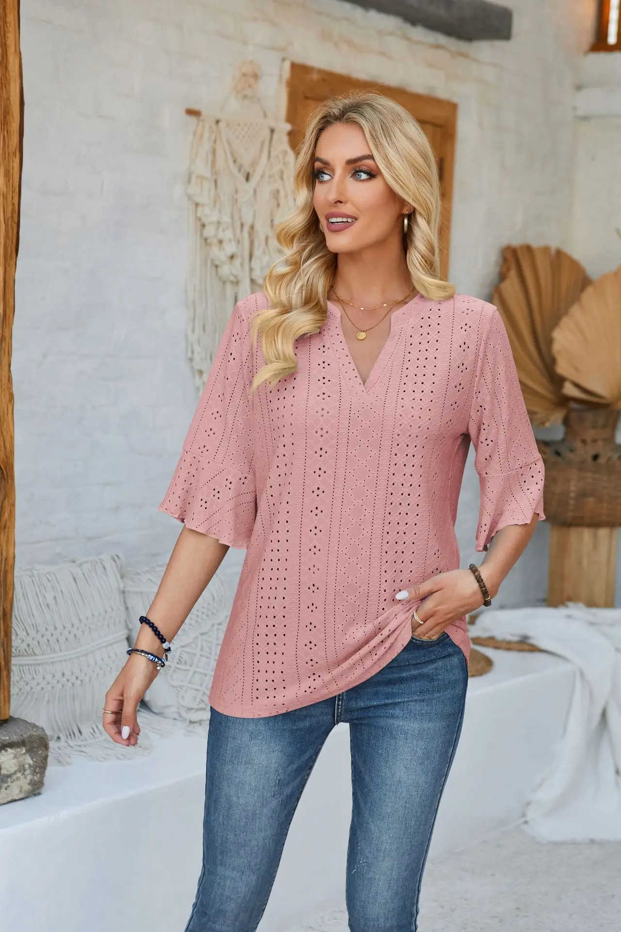 Women's Summer Blouse New Solid Color Half Sleeve Loose Casual T-shirt Hollow Out V-neck Tops Office Ladies Tee Women's Clothing