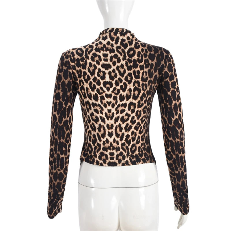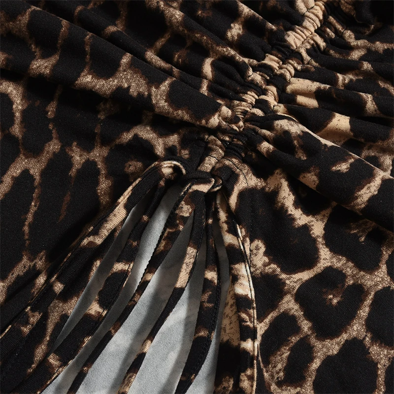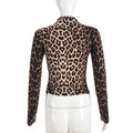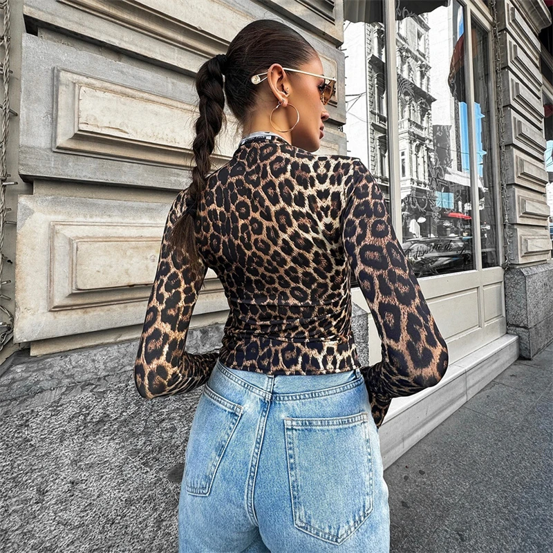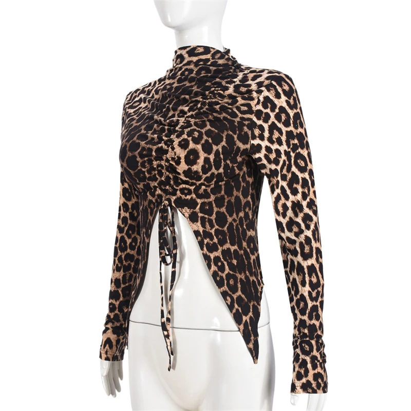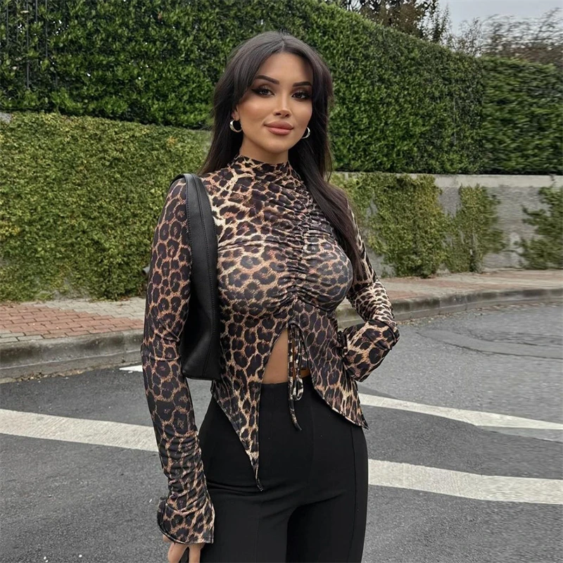 ZAROY Leopard Print Women Drawstring T-Shirt Spring Long Sleeve O Neck Slim Vintage Tees Lady Y2K Midriff-baring Tops Streetwear